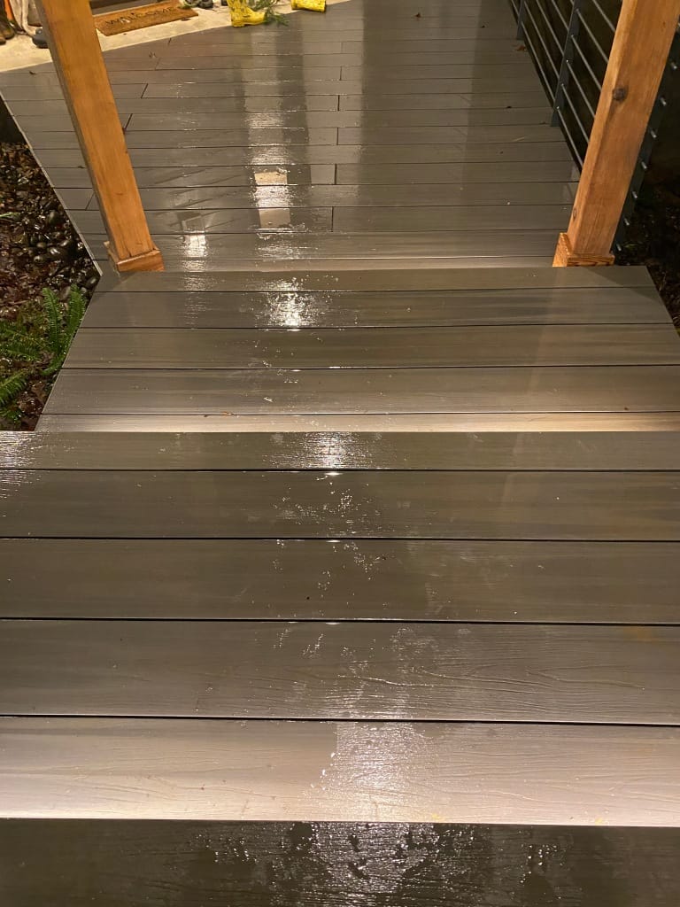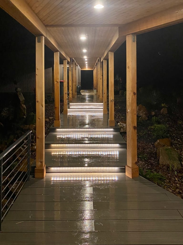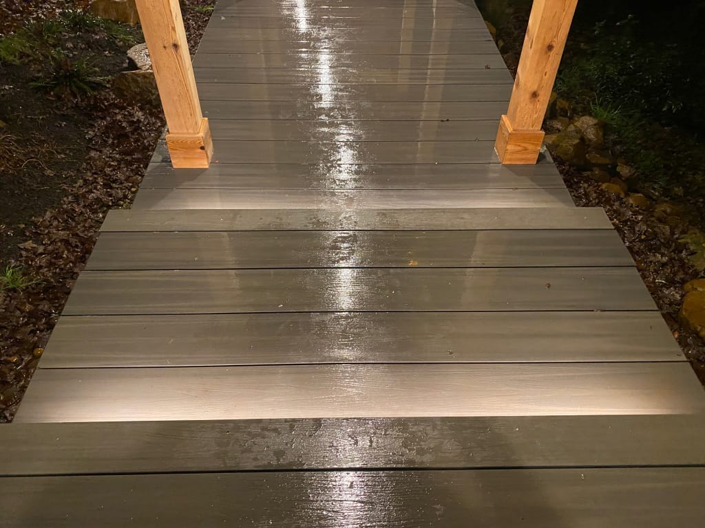 I've got a long walkway with five stairs going down it leading to my door and everything is a dull grey Trex-style decking that makes it hard to discern where the steps end, especially at night. I could have put a line of black grip tape on the end of each of the steps but I thought it'd look kinda ugly. Instead I wanted to tuck some LED light strips below the edges to put down a pool of light for a more subtle effect.