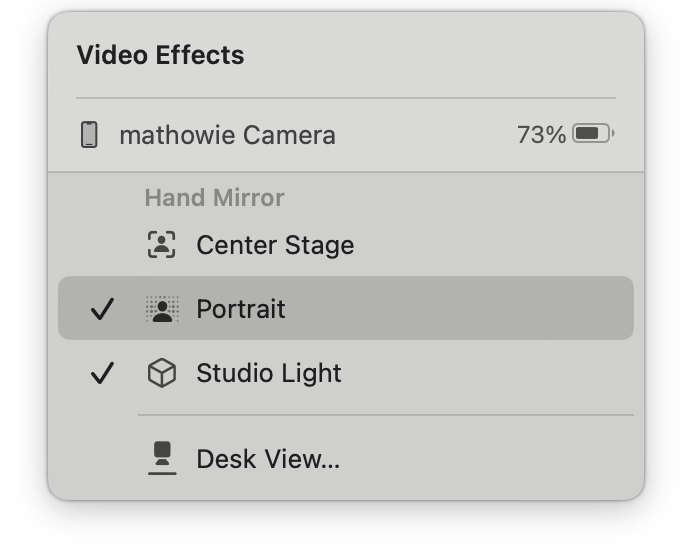 That's it! Go back to Zoom or Skype or Slack or whatever and use your phone as your webcam. It's pretty great. I also love that you can see your phone's charge on the Video Effects panel and it'll warn you to connect your phone to a charger when it gets low during a call.