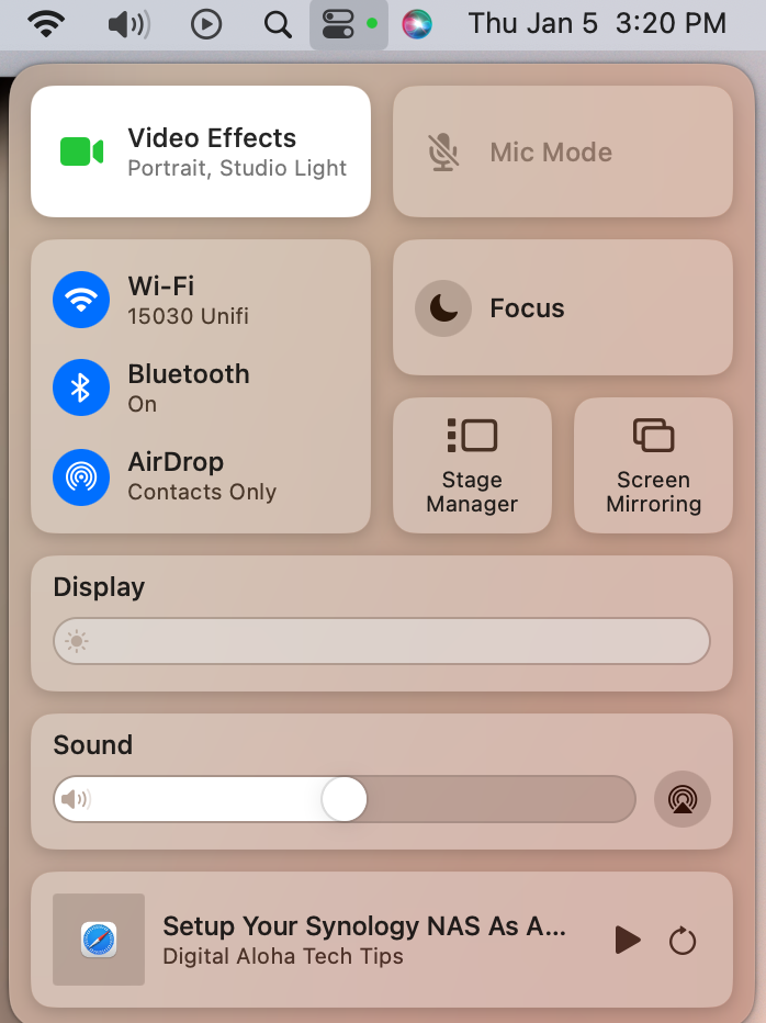 Step 4: Click the little switches in your menu bar and you will see Video Effects as an option to control the camera through MacOS