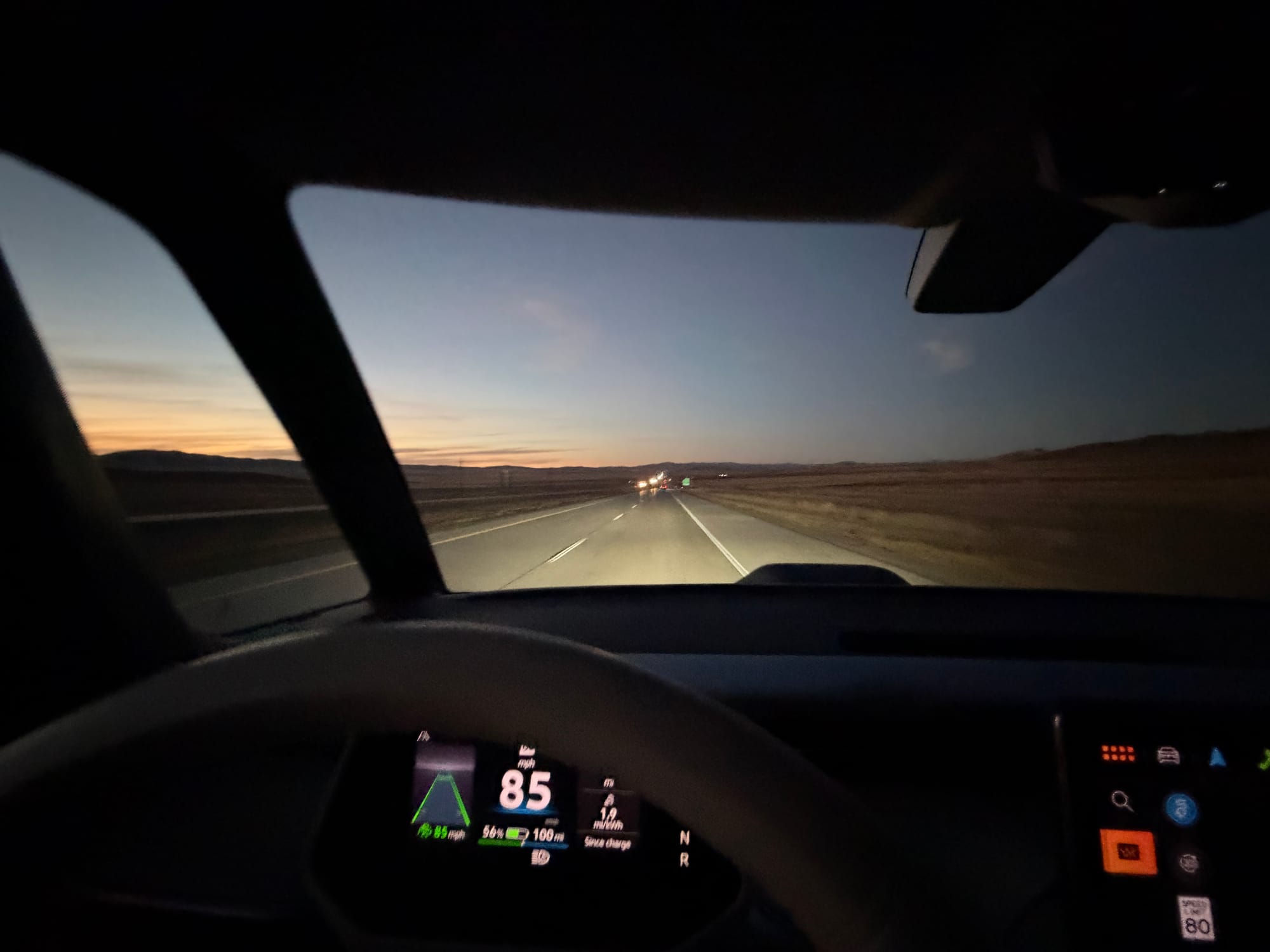 I quickly got used to splitting up each day into a series of two-hour windows of driving, going 100-120mi, stopping to charge, then getting out to stretch my legs. This approach does slow down a road trip overall, but it's at a more relaxed pace. I got something to eat at every other charger stop, I used a restroom at each stop as I was drinking lots of water, and I stopped to take photos more often. If I was tired, I'd take a 20min nap in the back seats with a blanket I bought along the way. I honestly enjoyed all the stops and wondered how I used to go 3-4hrs without stopping in a gas car.