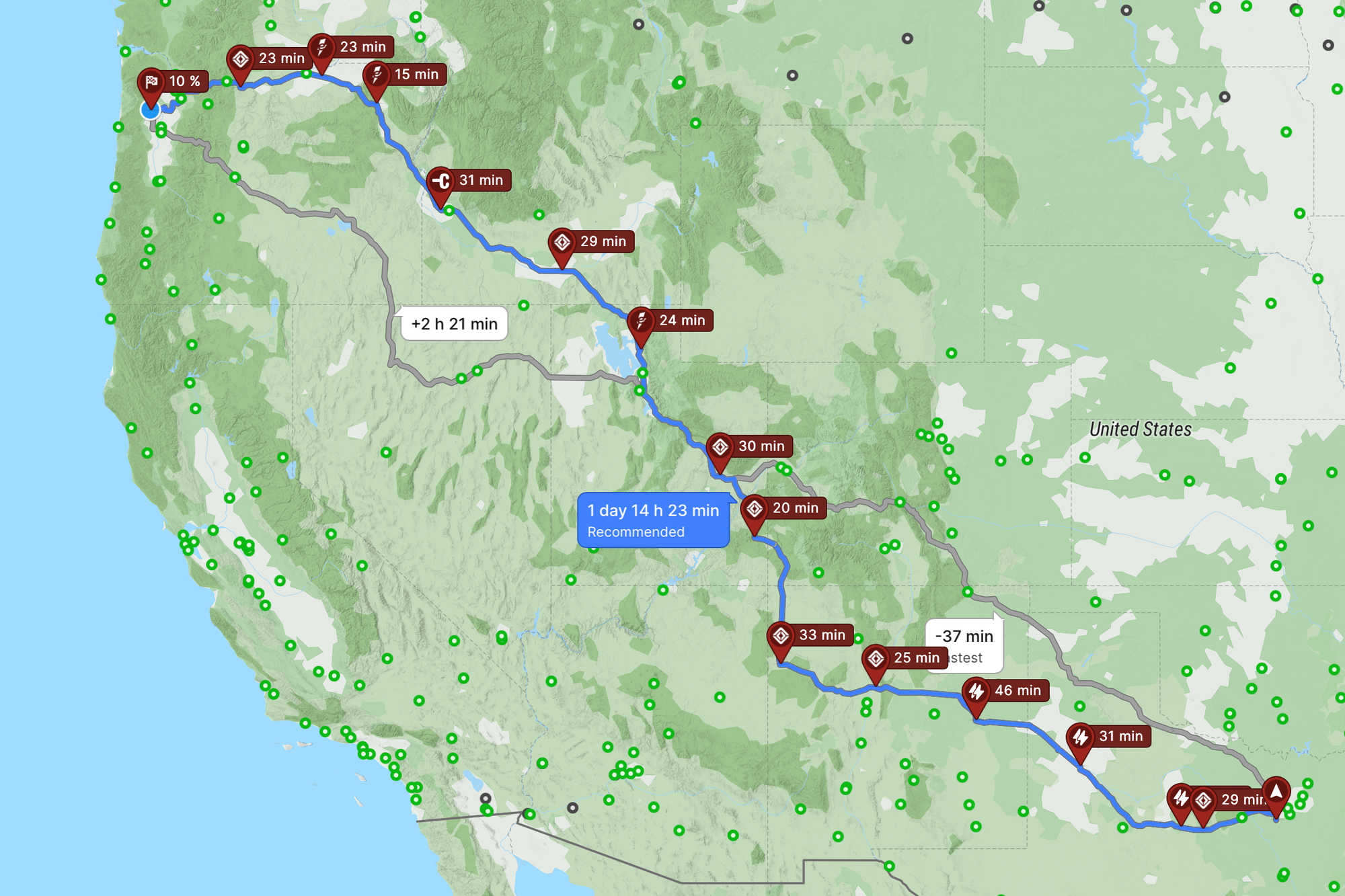 - Use Tesla's app find a charger for any spots that didn't have high speed charging options