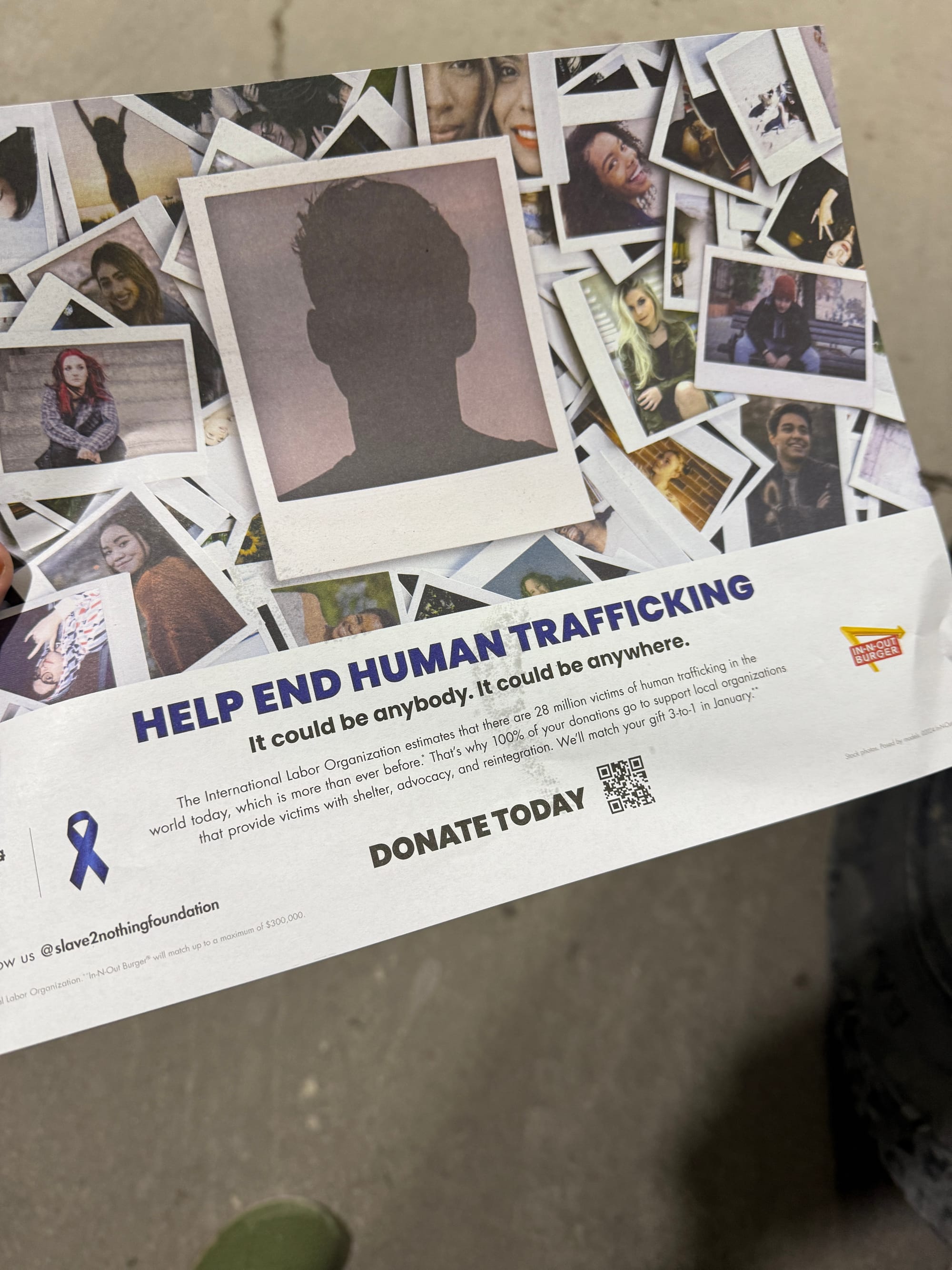 I don't know what's going on in Southern Oregon, but there seems to be a moral panic around human trafficking so much so that every Oregon Department of Transportation freeway sign for a hundred miles was focused on making sure everyone knew that human trafficking was bad. Then I stopped in Grants Pass for an In-N-Out burger and there it is on my placemat again. I've seen this stuff in airports and I'm dubious, because they throw numbers as if millions of people are being taken hostage worldwide and I'm not sure that's the case. It feels like the kidnapping of kids panic of the 1980s that was largely overblown.