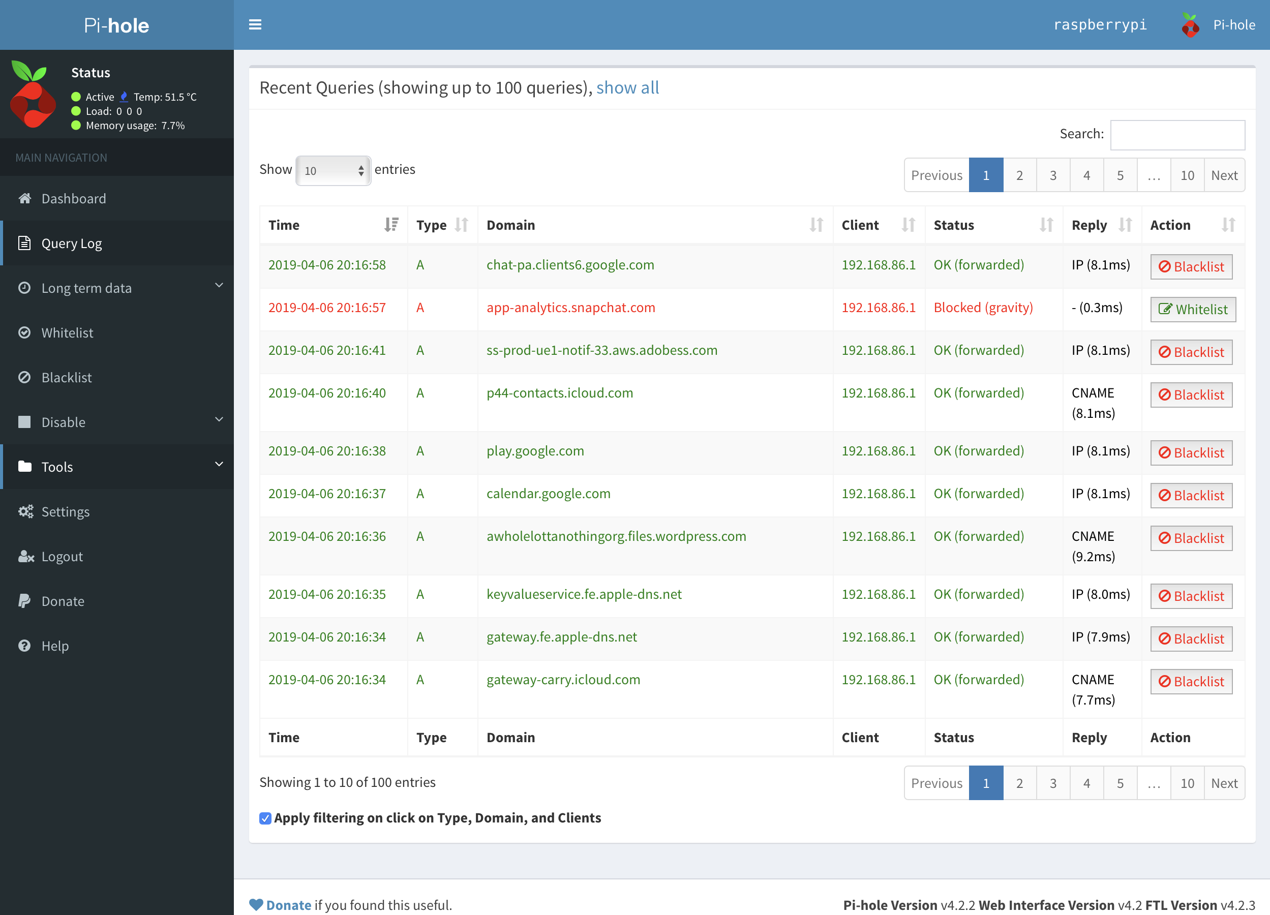 Once installed and running, the web felt a little snappier in a browser without an ad blocker installed. Most all ads are gone and according to my pi hole stats, 20% of my internet traffic that was spent on talking to ad server requests is freed up. No more whitelisting nag screens from sites, and finally, no more ads on my TV. About the only ads that remain are in the Instagram client (which I would pay Facebook money to remove if I could).