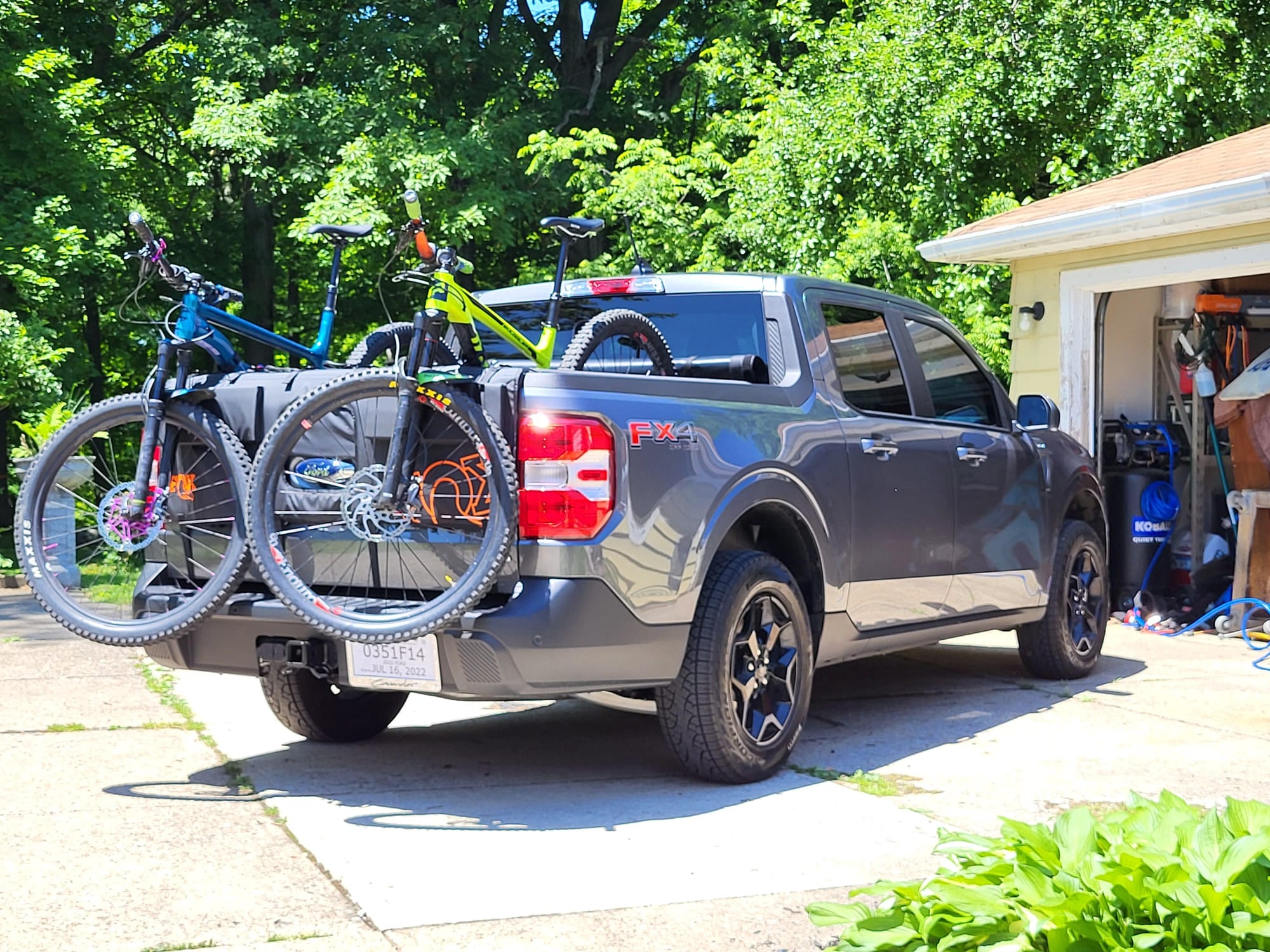 I drove our Ford Maverick pickup with my Canyon Grizl bike hanging off the tailgate, kind of like this generic product photo: