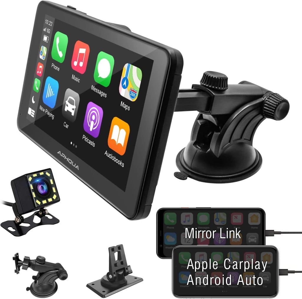 The image above is the Aphqua 7" portable CarPlay device, and it's about $159 on Amazon right now. The one in the photo at the top of this section is my slightly larger 9" screen model I bought for about $259.