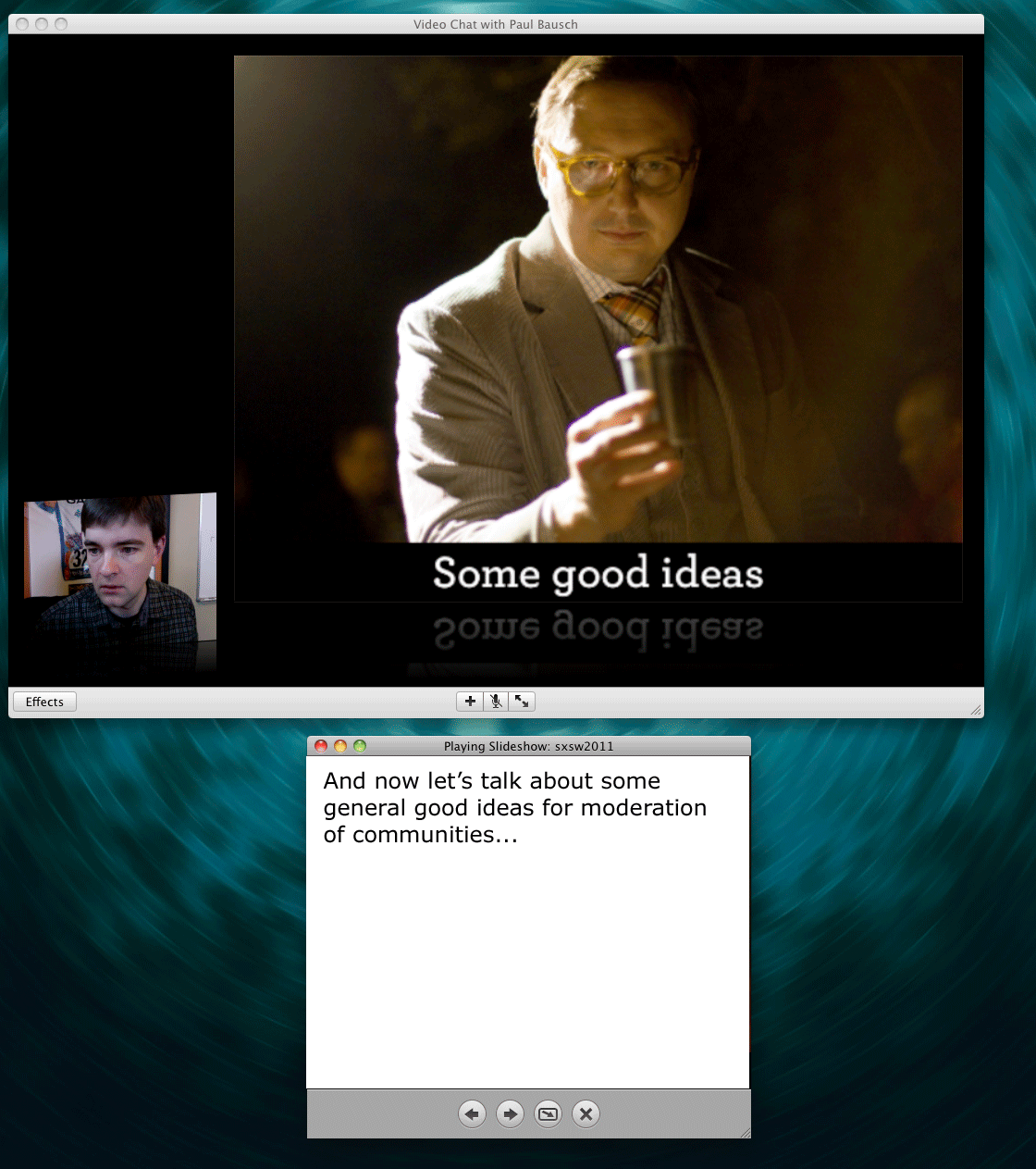 My last post linked to my SXSW talk that I recorded at home. A lot of people asked me how I did it, and it required the following steps: