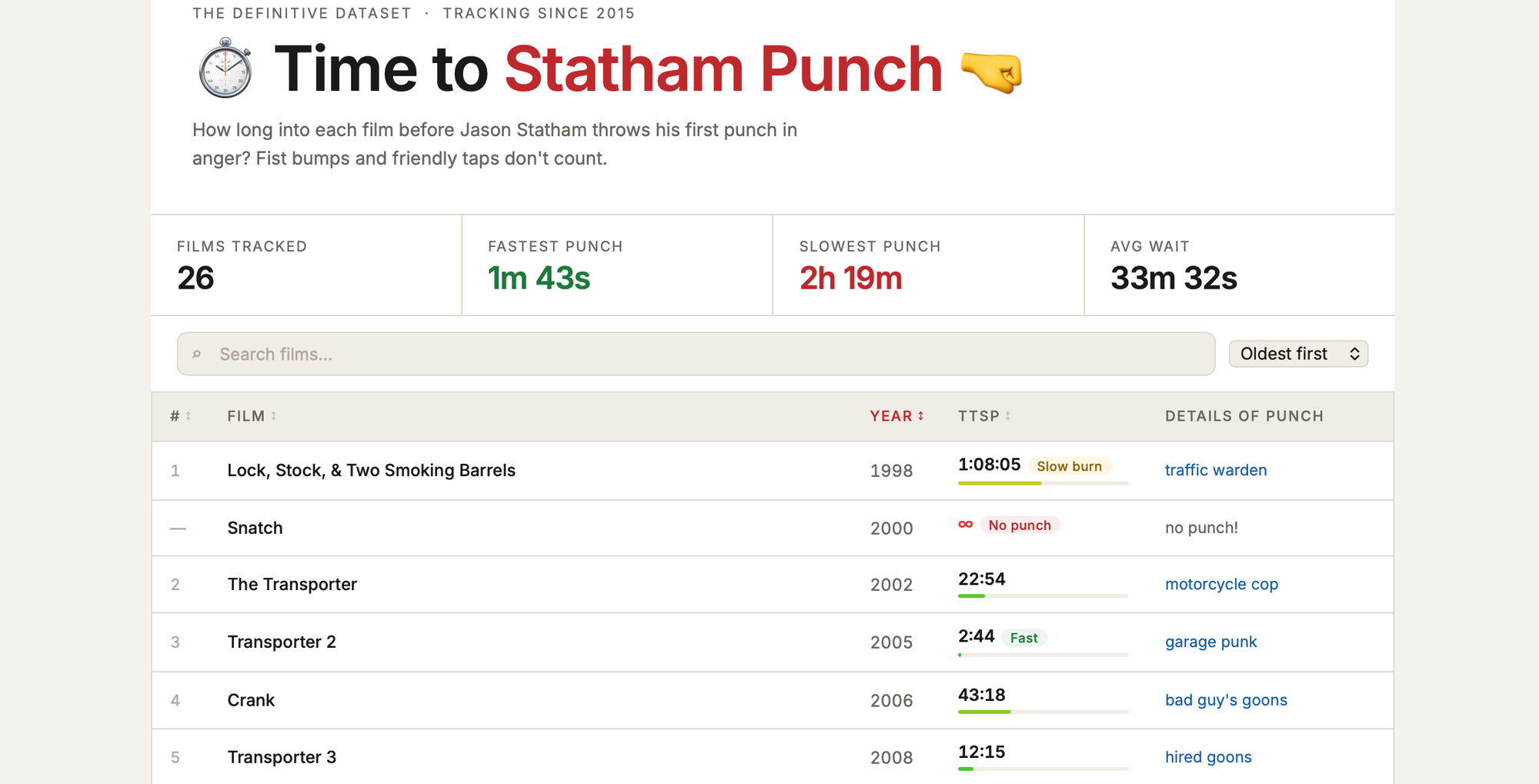 Years ago, I was joking with a friend in a theater as we sat down to watch a new Expendables movie starring Jason Statham. I said "I wonder how long it'll take before he punches someone in the face?" and to continue that joke I started the timer on my watch and showed him my wrist. Later, I posted a screenshot of my watch to Twitter with the caption that it only takes 14 minutes to enjoy a punch in that flick, and people seemed to love it, so I kept doing it. Then I took all my tweets over the years and posted them to a single page website.