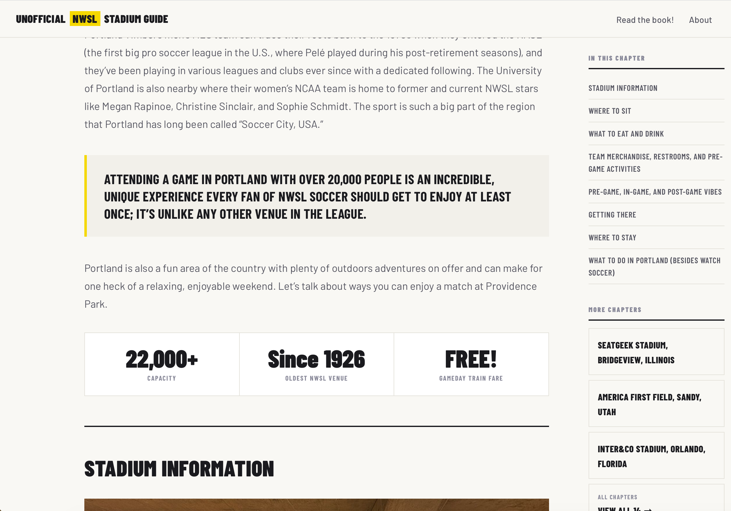 My wife and I have followed women's pro soccer closely for over a decade and when the league was adding new teams several years ago, I thought about how I'd personally been to almost half the stadiums, and with a few flights I could see the other half and write it all up for anyone else traveling to see pro soccer games in unfamiliar stadiums.