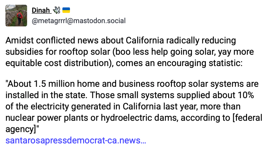 It's kind of an amazing stat: just 1.5 million solar installs in a state with nearly 40 million people is responsible for 10% of all electricity generated statewide. I can't read the reference as it is behind a paywall, but that's an encouraging and incredible stat. For a place so incredibly sunny, it's wild we're not doing everything possible to promote more use of solar in states like California.