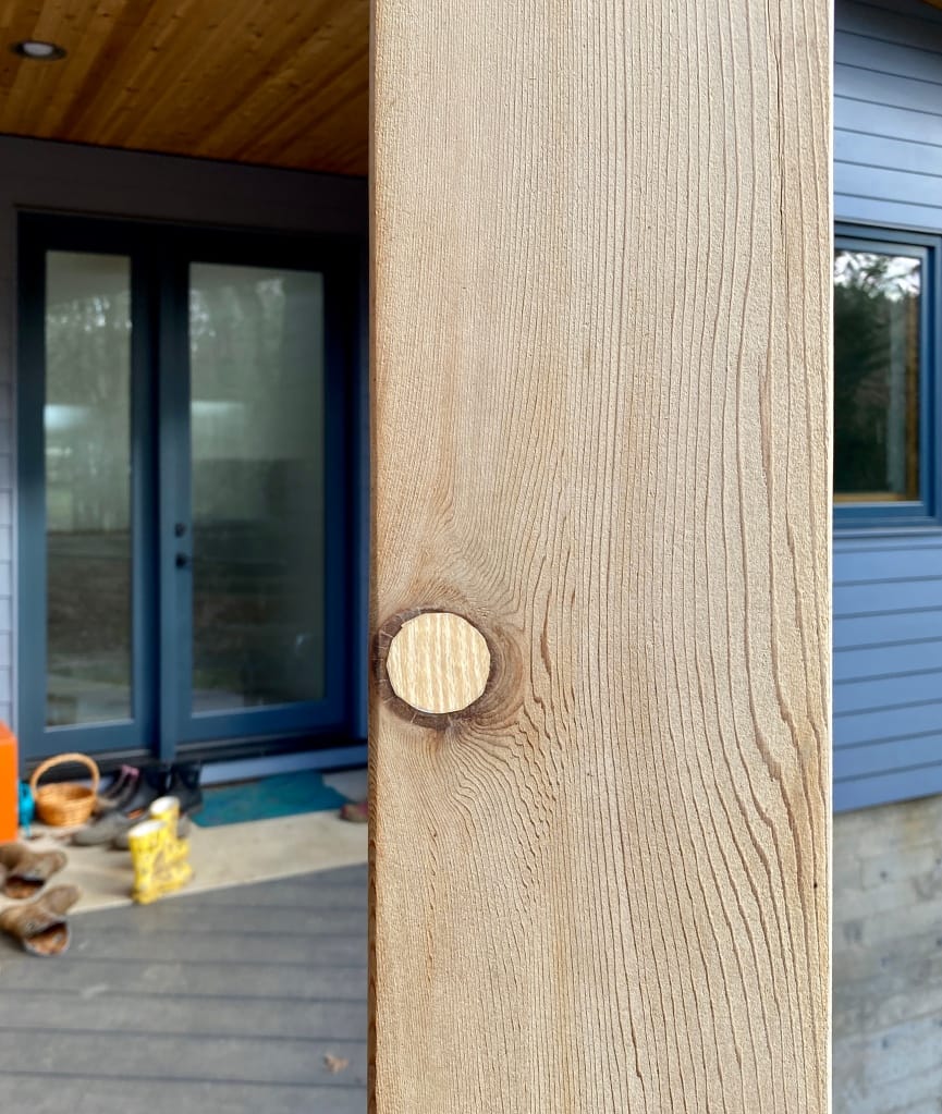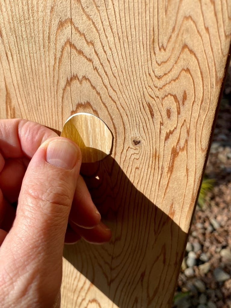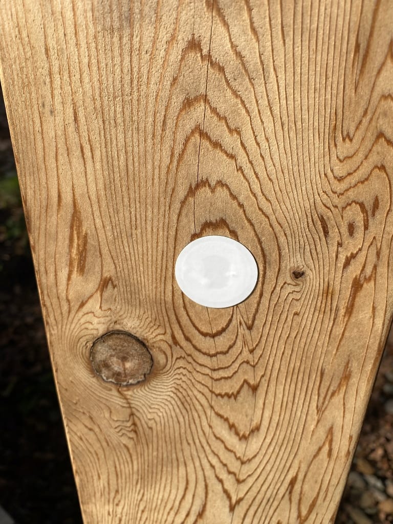 To make them blend in a bit more, I went to my local Lowe's and bought a $5 roll of adhesive-backed shelf paper in a maple pattern that mostly matched my wood posts. I used a NFC tag as a template, traced it onto the paper, and cut out two holes, then pulled off the backing and stuck them over the tags. From a distance, you can barely tell they're there since I put the NFC stickers over wood knots and they look like wood repair patches now.