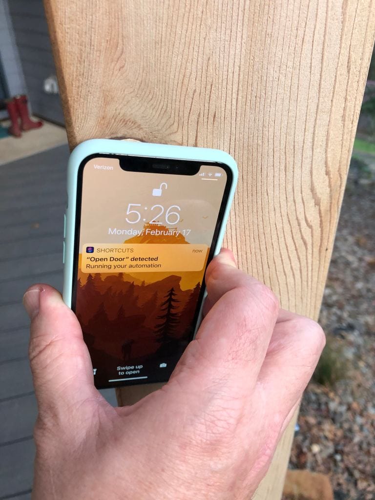 I tapped one of the NFC discs on my desk, and set it up to run a custom "unlock front door" shortcut just for my phone (other people can't tap it and get anything to run). Then I setup a second one to "lock the front door" as well. Then I stuck them outside on some posts, one leading towards the front door (to open) and another on the first post on the way out (to lock).