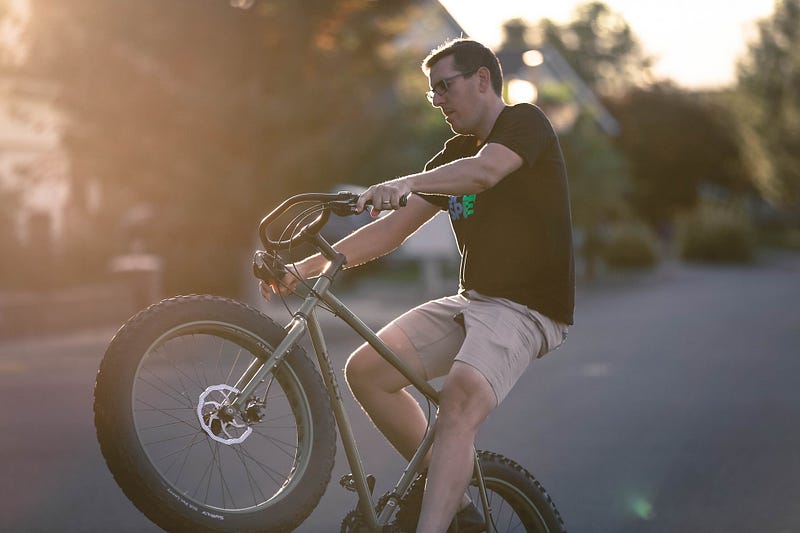 The bike fit me perfectly, had a relaxed feel, and with 15lbs of air pressure in the tires (“That’s the most I’ve ever inflated them!”) the ride was nothing like I imagined. The huge four and five inch tires rolled effortlessly down the street. I jumped off a curb, I darted through traffic, I popped a wheelie. However much this bike tipped the scales, it felt like any random 20lb hardtail mountain bike, and it was wickedly manuverable, which surprised me even more. I fell instantly in love with this giant overgrown BMX bike underneath me.