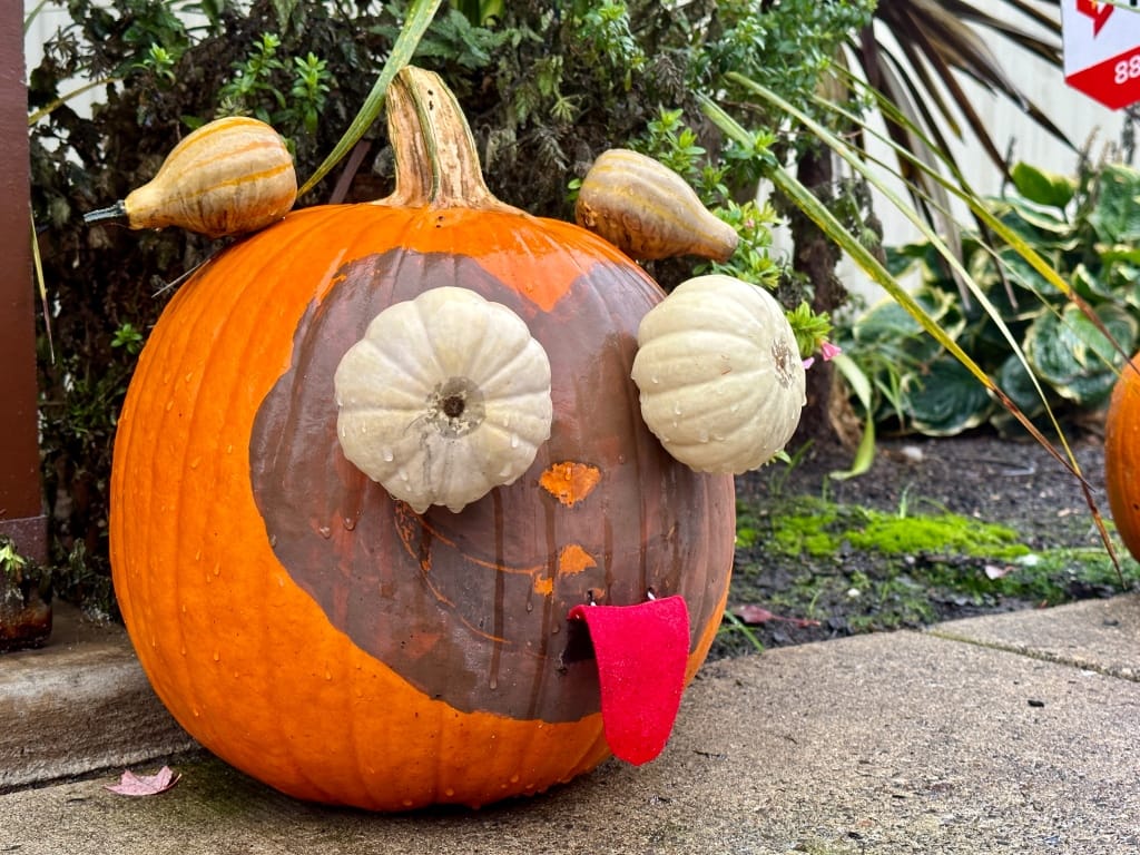 The most impressive thing I saw this year was this Pug pumpkin that looks remarkably like the derpy pug from the movie The Mitchells vs. the Machines by using just a few smaller gourds and some paint.