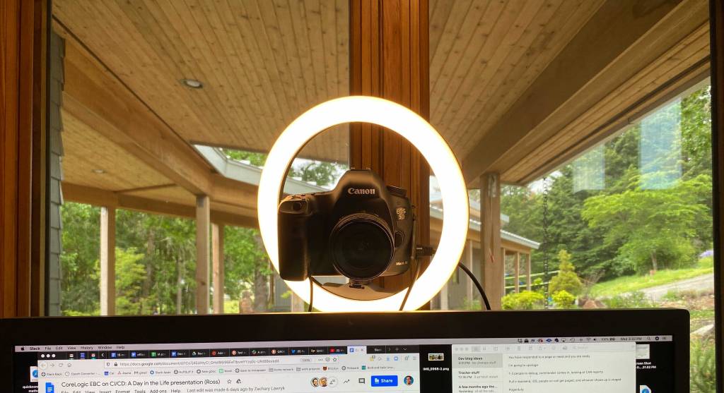 Set up your camera and tripod and lights in a place you won't have to move them. All of it connects to a Macbook Pro with a single USB cable, so you can still use your laptop as a laptop anywhere on earth, but you'll want to go to your home office or desk when you need to do video calls.