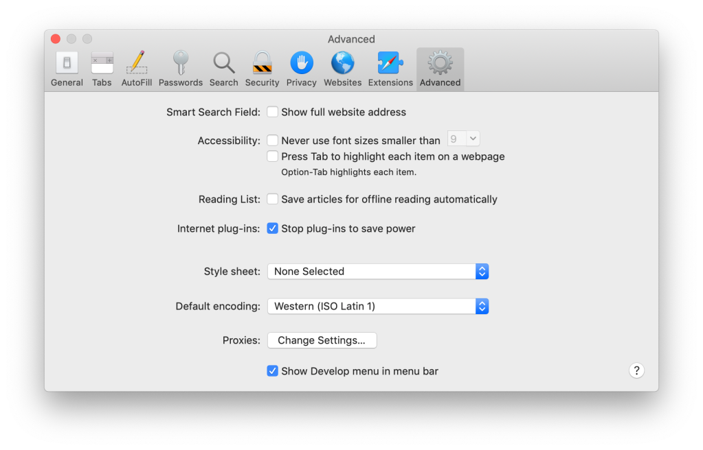 2. Go to Safari Preferences, under the advanced tab, then enable the Show Develop menu in menu bar
