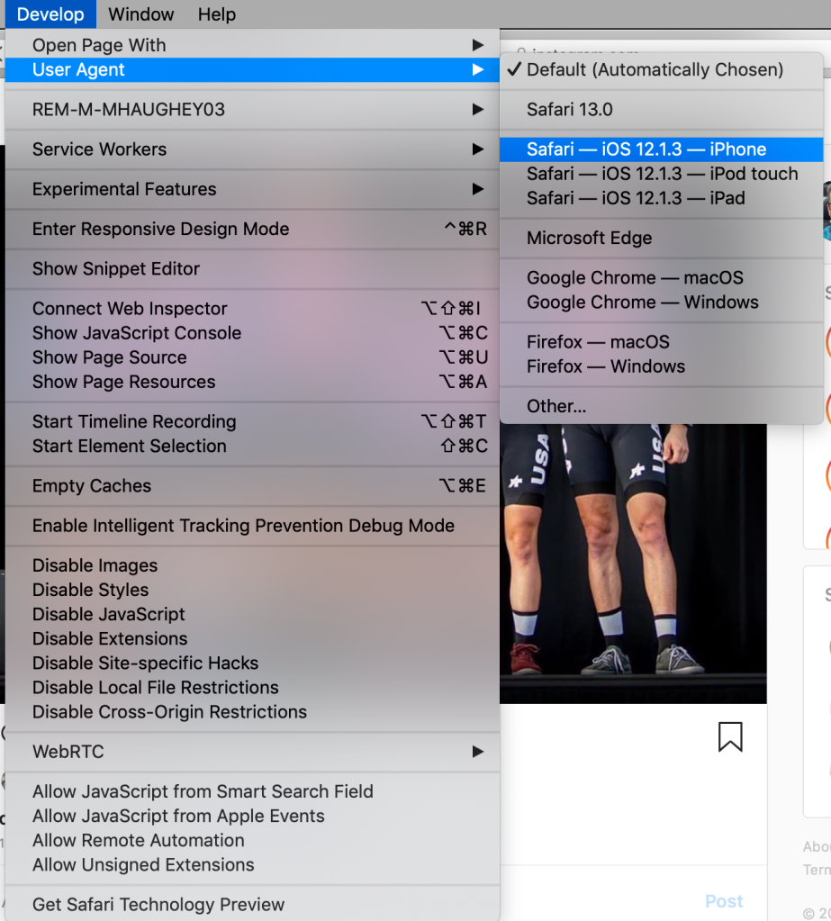 3. Go back to Instagram, click that new Develop menu and go to User Agent and select Safari - iOS