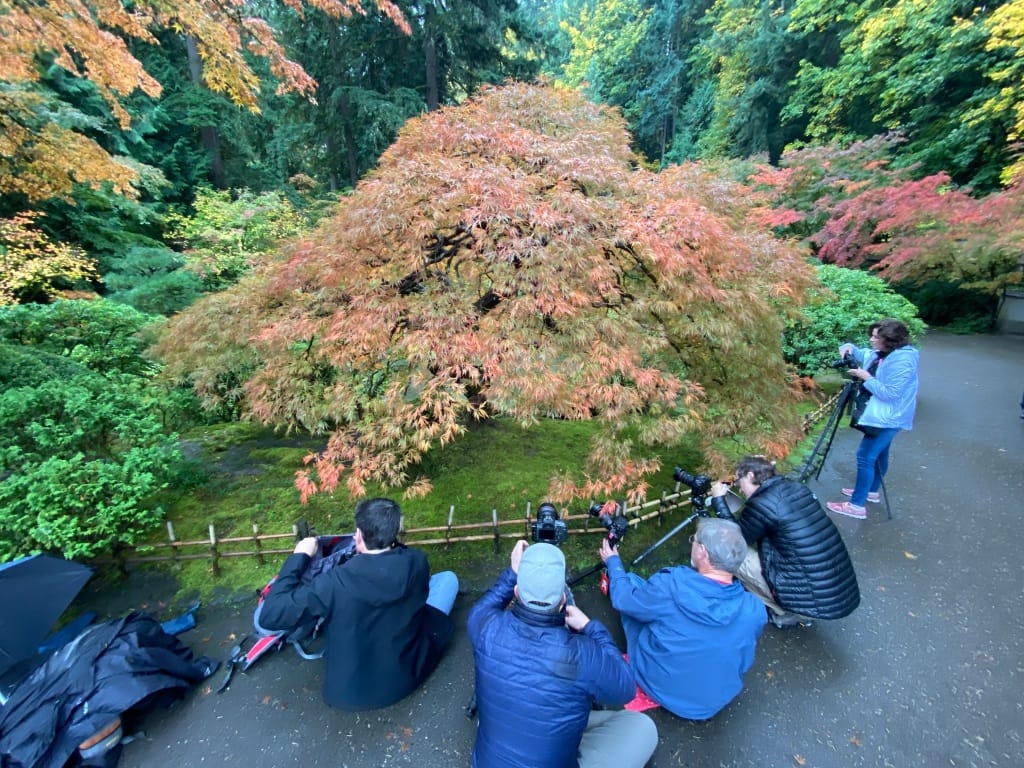 The gardens hit peak Fall color a week or two after most of Portland, I believe because it's in a weird little shady canyon that doesn't get much sun. If you are there a week early or late, not to worry, you'll still get great shots and there will be many Japanese Maple trees showing great color.
