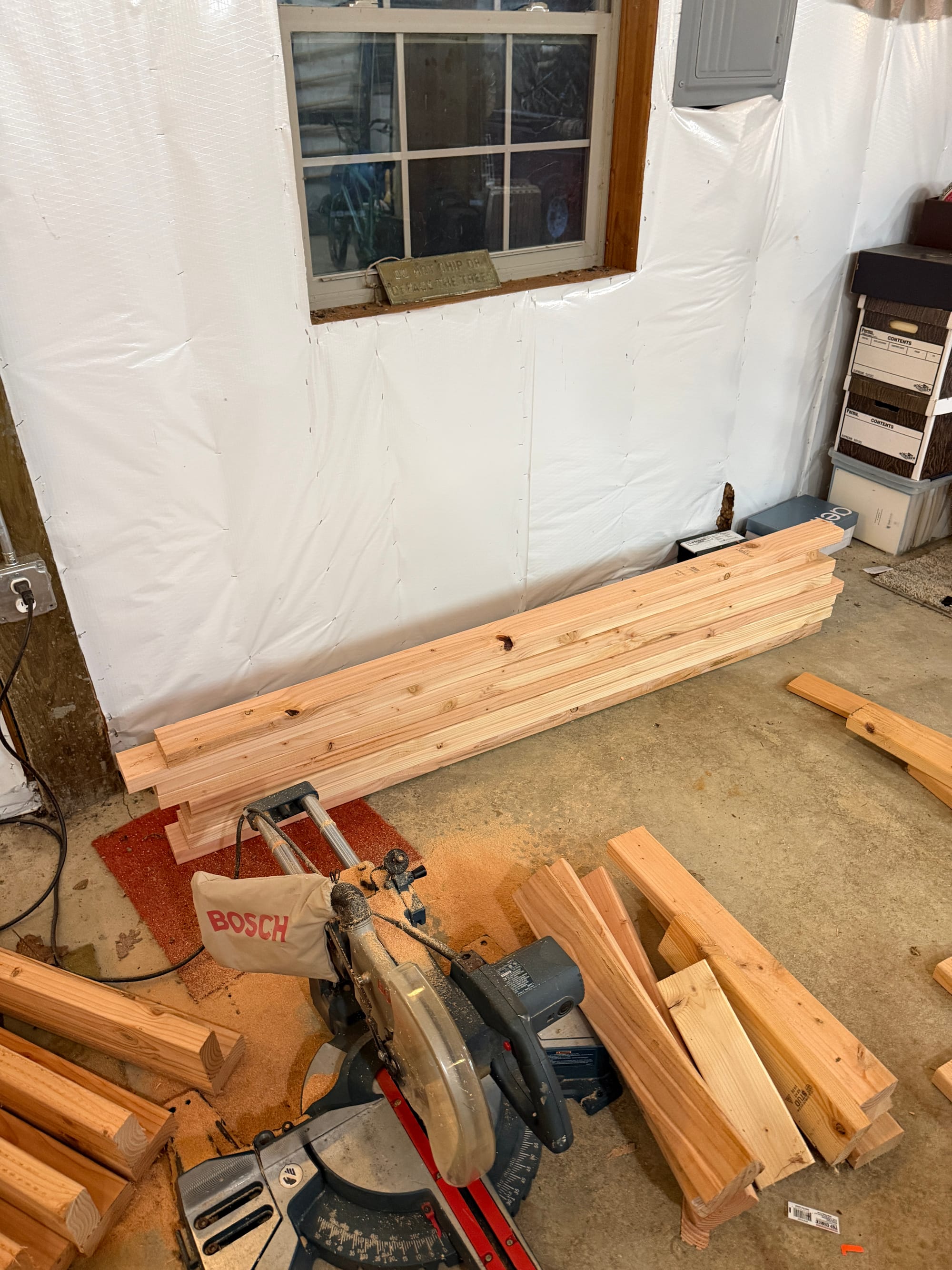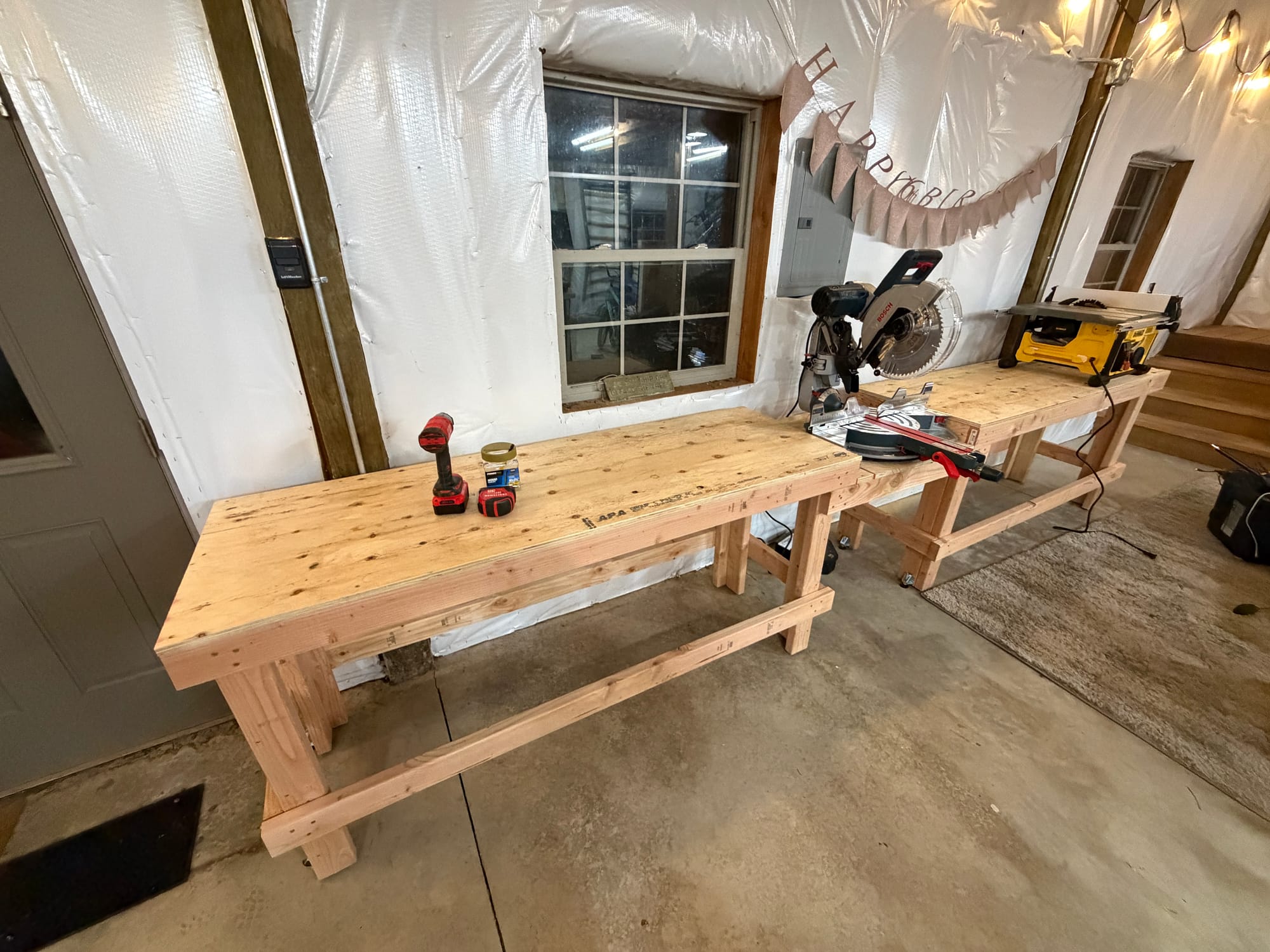 I built a miter station and two long workbenches. No longer would I have to use a saw on the floor, as the miter station means I can comfortably make accurate, repeated cuts using stop blocks and clamps. Having this means I can make four perfect-height legs in a few seconds, which is the basis for almost any other build.
