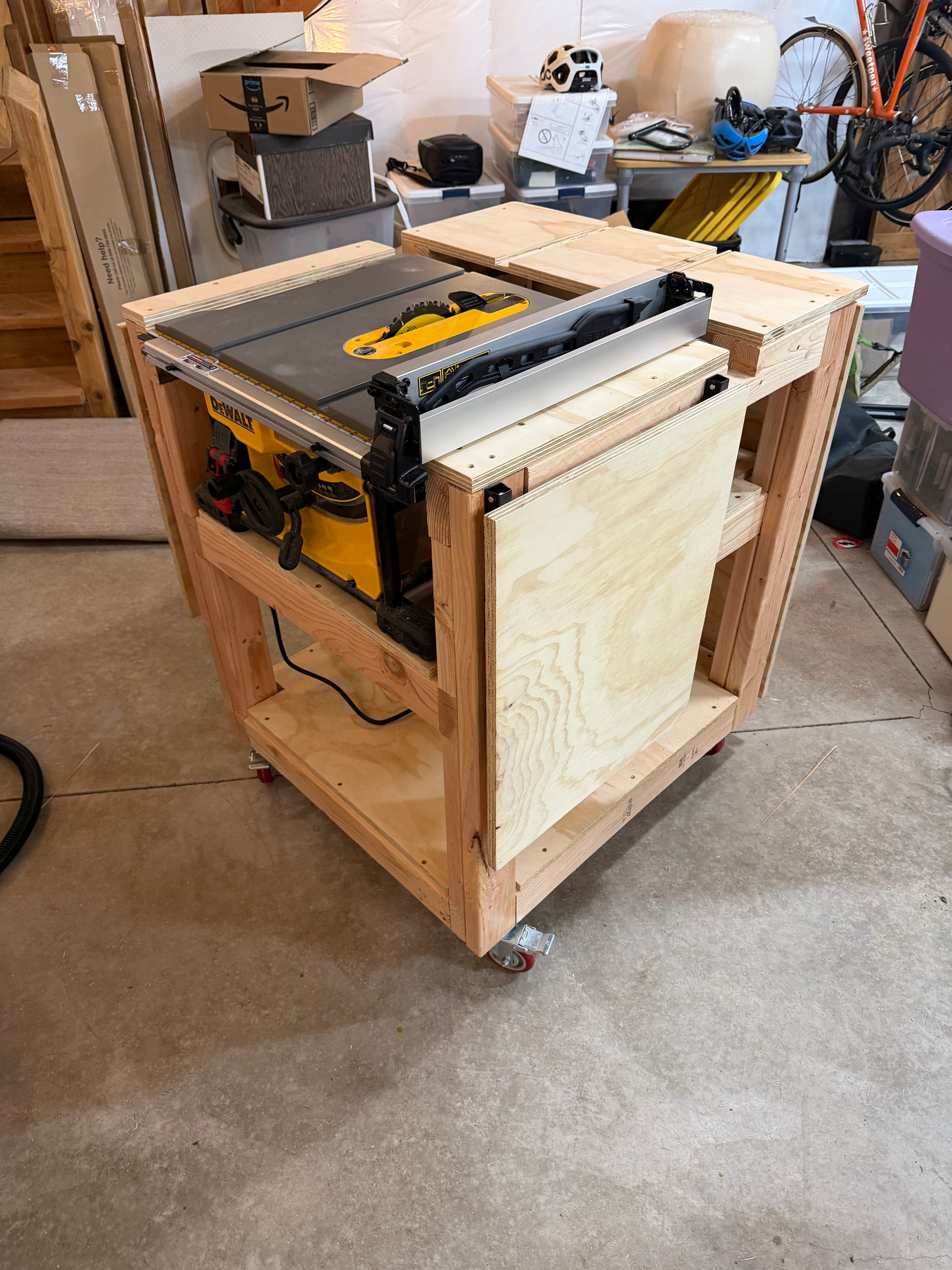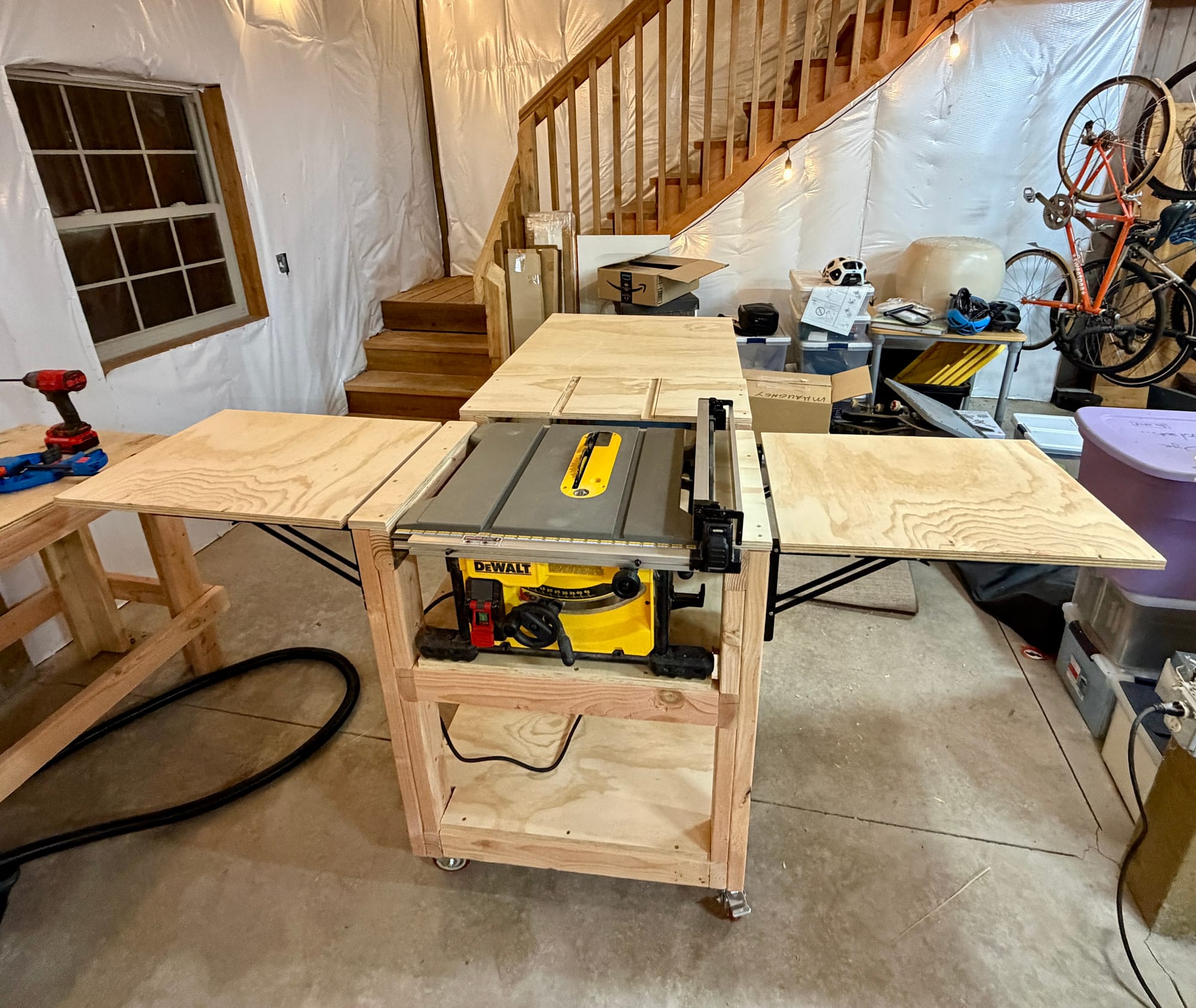 Everyone who starts woodworking has to first build out their space so they can eventually build the things they want to. And so, once my first project was complete, it only took me a couple days to build a table on lockable casters for my new table saw. I love the expanding outfeed shelves since they let me rip down whole sheets of plywood, but it also collapses and can be shoved into a corner when not in use.