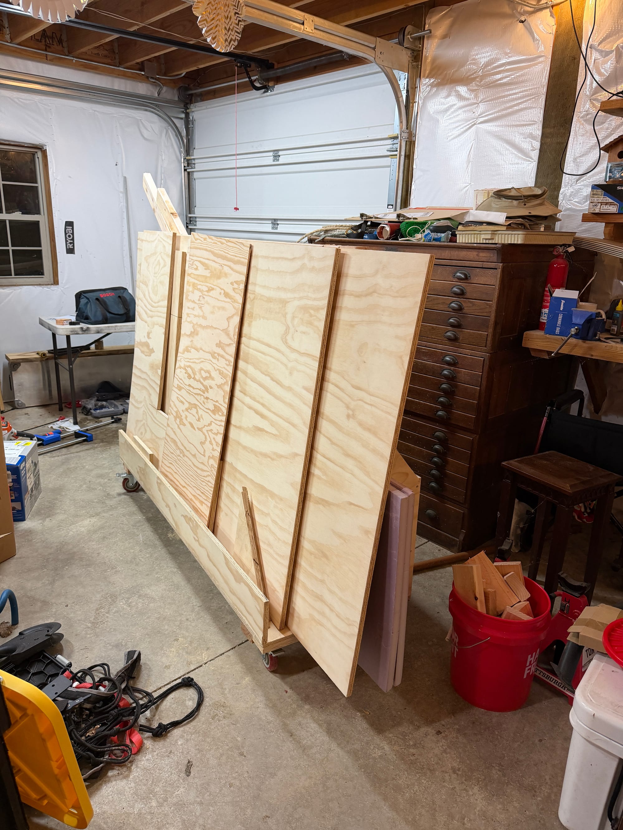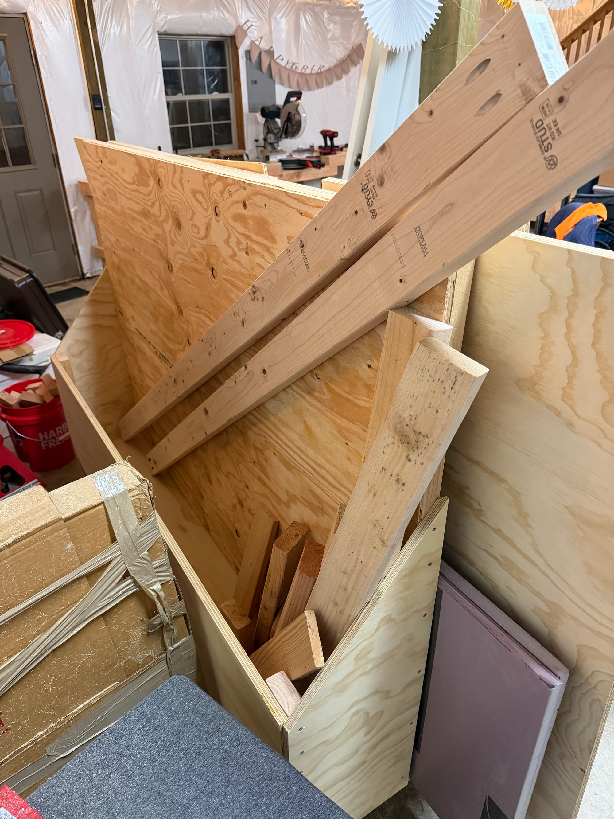 My newest project is a rolling wood storage bin, so I can keep all my lumber in one spot. This only took a couple hours to build since I had my table saw and miter saw within easy reach and ready to go.