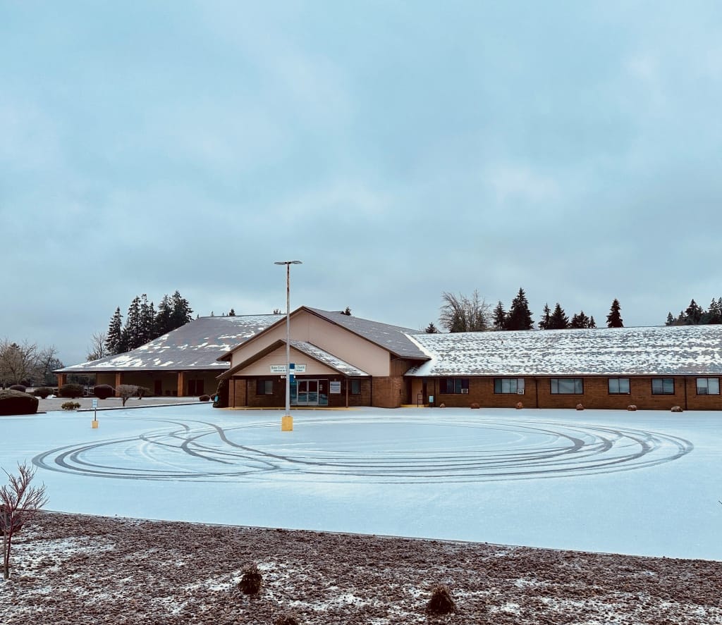 Last night as I was driving home on a sheet of frozen rain I saw some teens hooning it up in some parking lots and woke up this morning to find every big parking lot in town has these perfect donut-shaped burnouts in them.