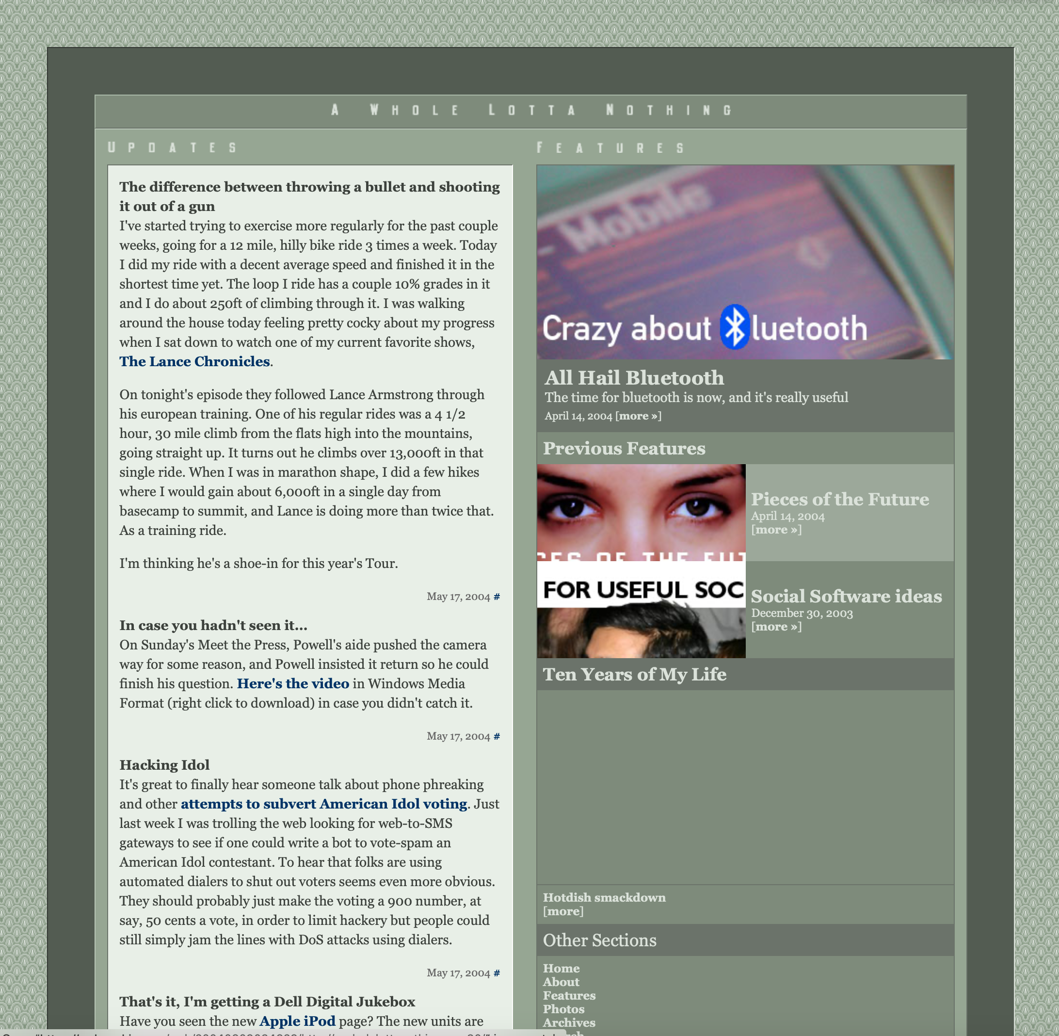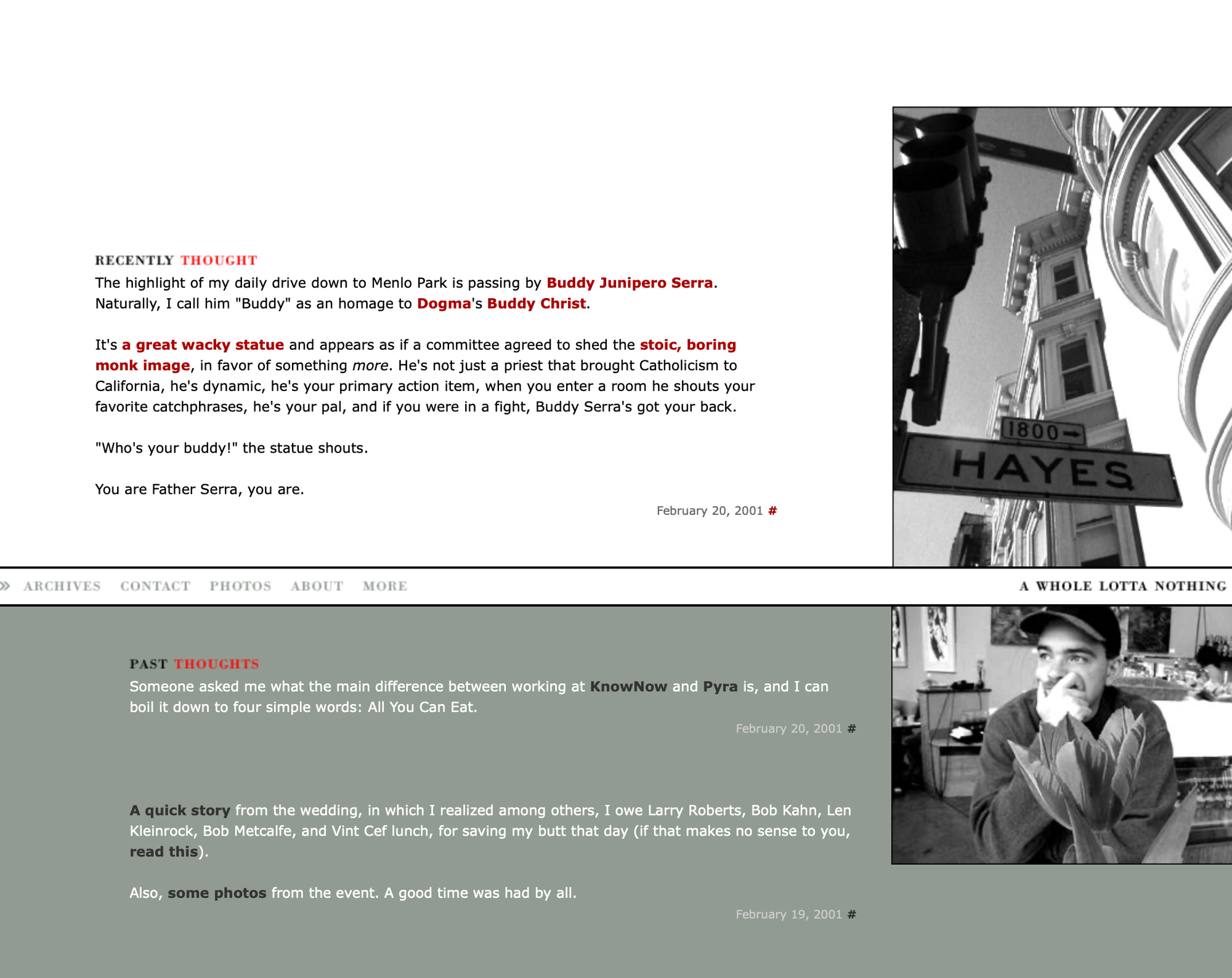 When my time at Blogger ended in early 2001, I bought the cheeky self-deprecating domain "wholelottanothing.org" and built a new blogging system in one night out of spite for the previous CMS, and launched this very site here at the new domain a.wholelottanothing.org.
