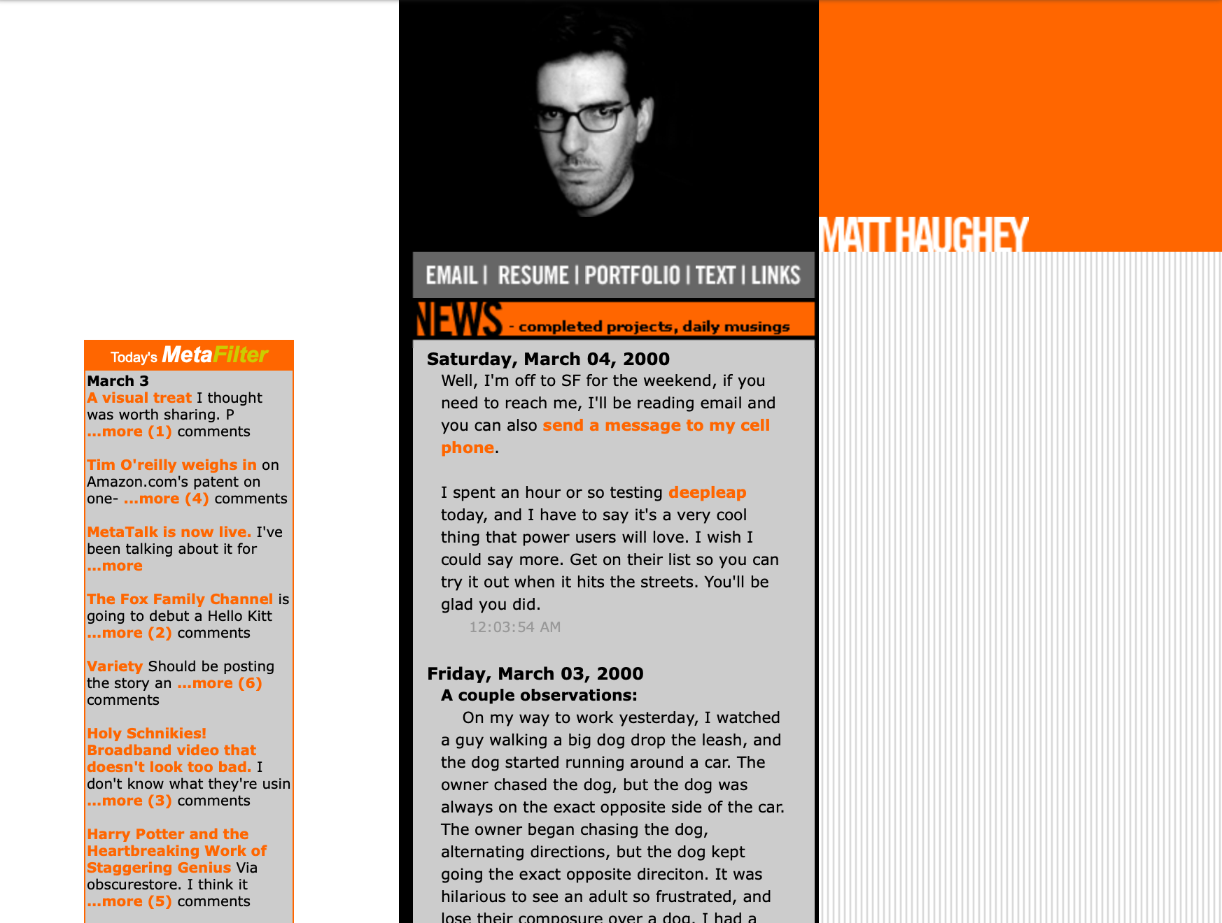 I started working on MetaFilter in the Fall of 1998, but just before launching it I realized the new blog I built was for a community, not just me. So I built a little blog engine to power my personal domain starting in Summer of 1999.