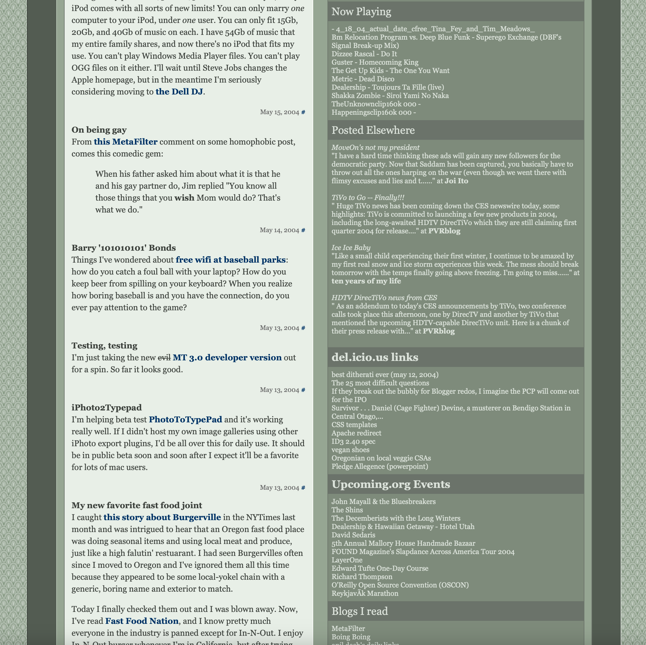 A year or so later, I got tired of fiddling with my own code again so I moved this site to TypePad, which was a hosted version of Movable Type. This was huge for me, because it was the first time I ever used an outside service for hosting all my content. I still made my own custom templates at Typepad, but I didn't have to run my own server, and I instantly felt relieved.