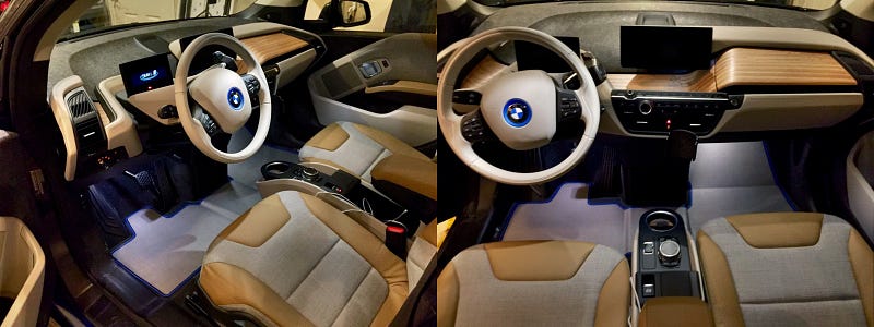 EVs also mean car designers have a new blank canvas to work from. Look at the picture above of my i3's interior. As a friend said, it looks like a W Hotel’s lobby on wheels. There’s no transmission tunnel, so the space between the seats can be used for storage. My dashboard is a series of floating tablet monitors and there’s no CD player or media input in the dash — it was designed mainly for bluetooth audio from phones. It’s all new and exciting and it’s good to see car designers bringing a sense of whimsy and utility into every aspect of these cars.