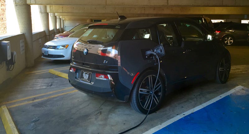 EVs come with a standard 120v wall charger, but even with a small battery like my i3, it takes 10–20hrs to recharge the battery to full. In the first week I owned the car, I found myself gradually depleting the battery, as each night it couldn’t completely restore the power I used the previous day.