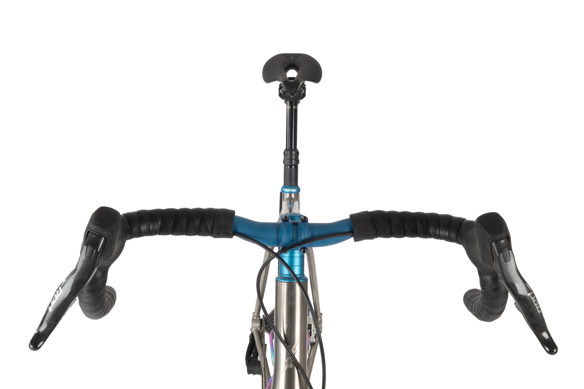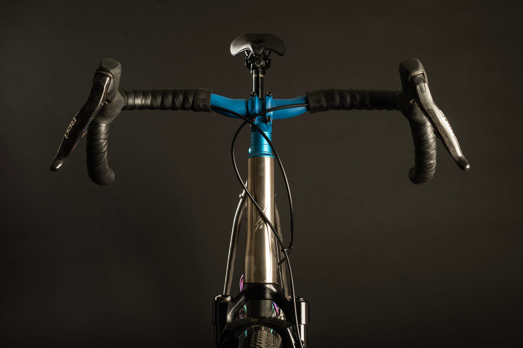 - I custom painted the Wolf Tooth 38t front chainring, Specialized 46cm gravel flared bars, K-edge bike computer mount, and PNW design stem in a blue ceramic cerakote that's tougher than powder coating and done up to match the rest of the anodized blue bits.