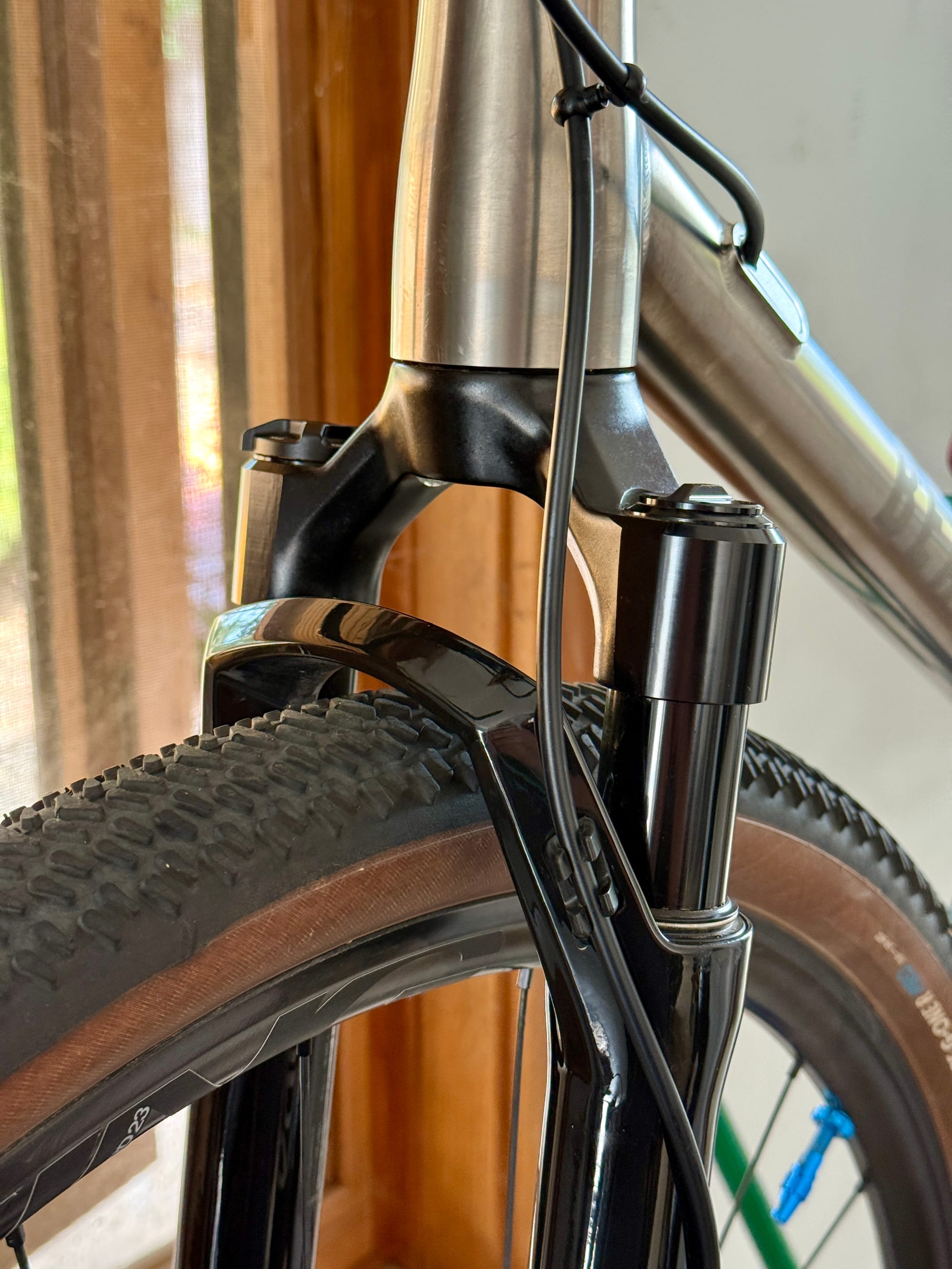 For this bike I wanted a dedicated suspension fork. Gravel bikes don't typically have front suspension, but over the years I've experimented with several, using a stem shock absorber in my previous Specialized Diverge bike as well as Redshift's suspension stem on my Canyon Grizl. I knew a suspension fork would be smoother on rough downhills, so I picked a Rudy Ultimate XPLR 40mm gravel suspension fork.