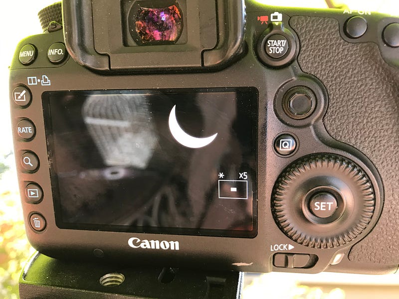 - After fumbling with my camera at the precise moment, if I had to do it all over again, I’d keep the same setup, but remember to put my camera from manual mode set to snapping incremental shots into automatic mode for the totality photo. Or I’d setup a second camera just for the totality without a dark lens filter.