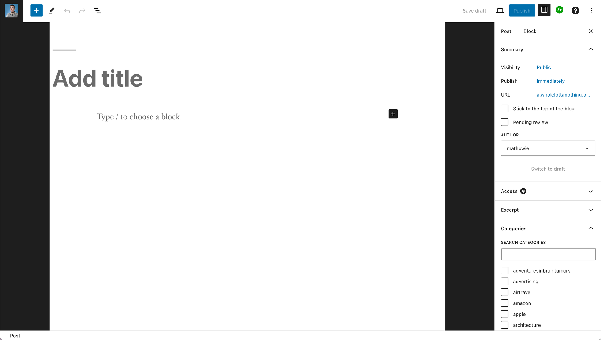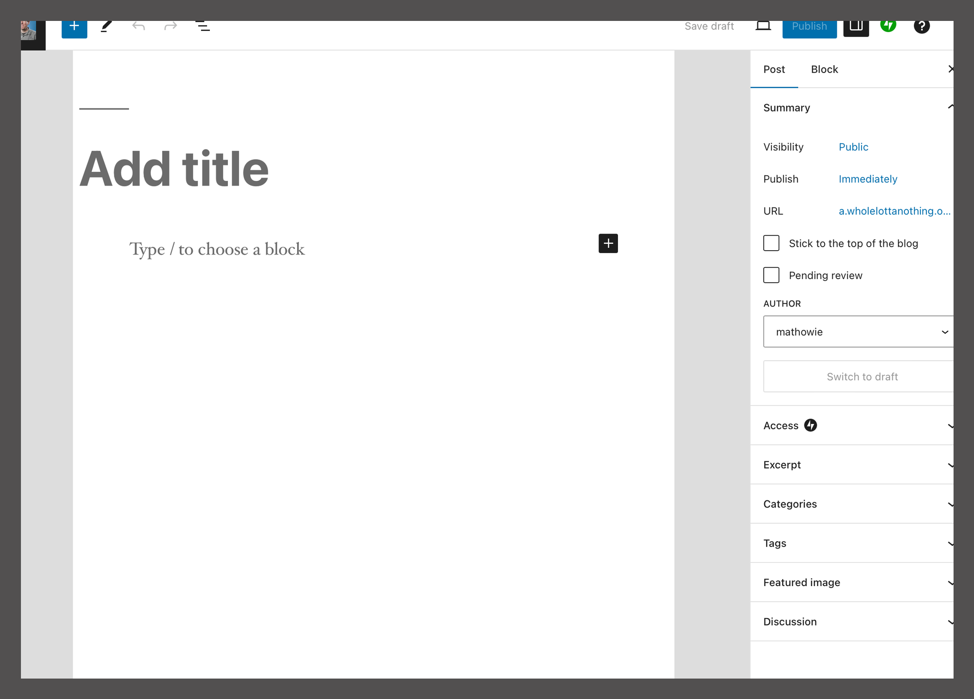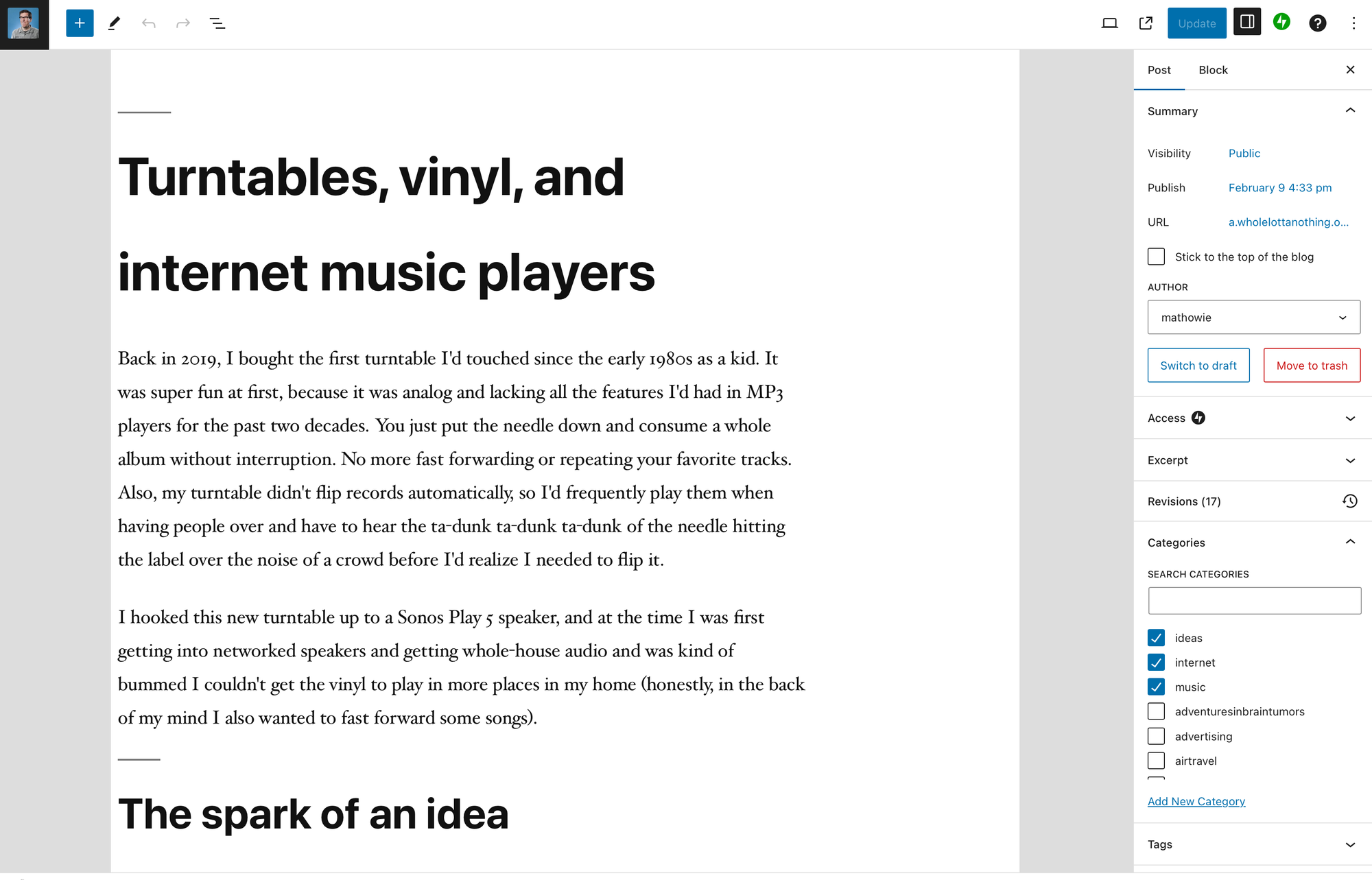 And here's Wordpress, where you get that weird letterboxed margin look, but also tons of metadata going down the side, including both categories and tags, which I never understood (also: categories are required, but they default to the unhelpful Uncategorized category, which, I dunno man, pick a lane and make everyone use tags or categories but not both?):