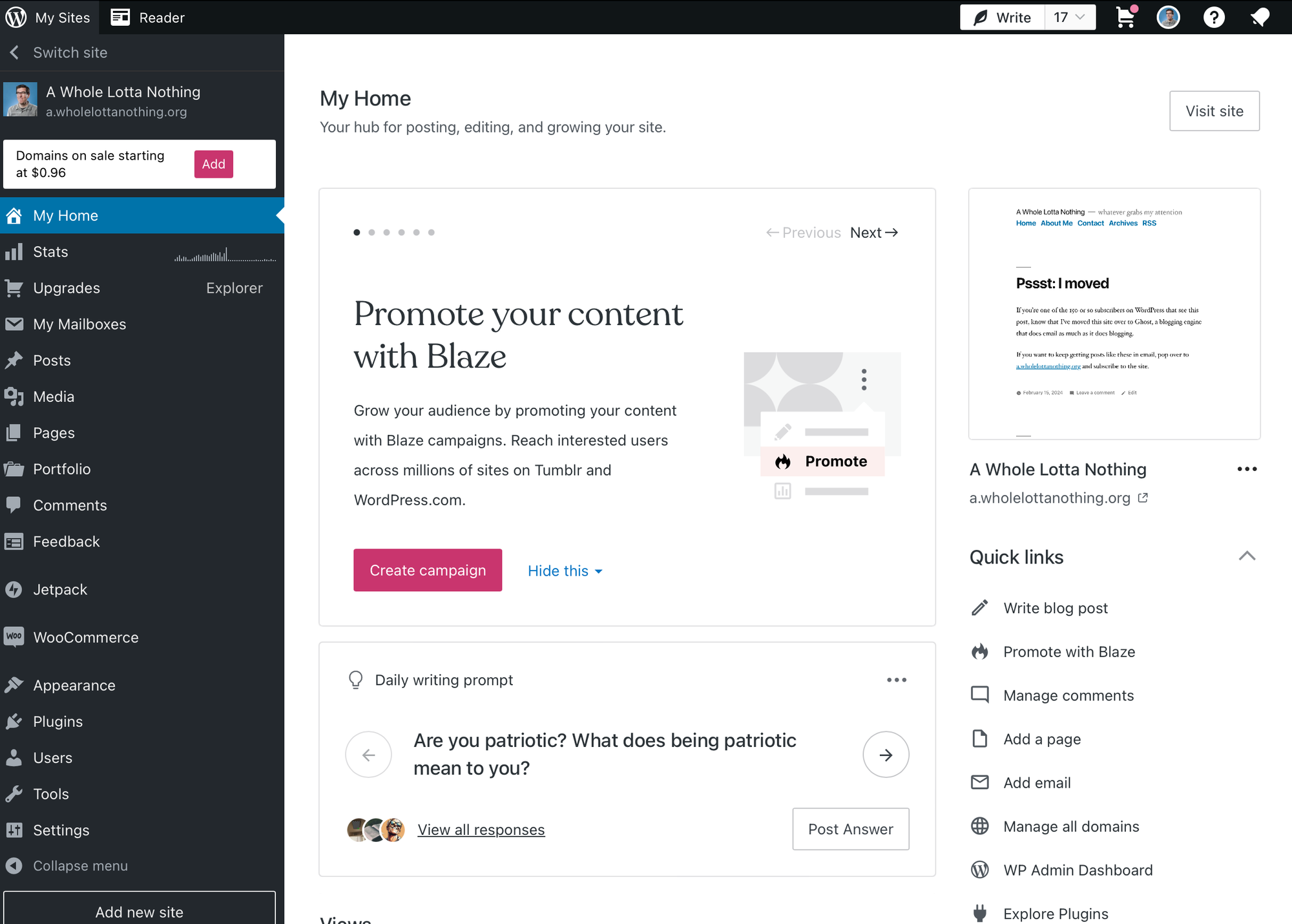 The Wordpress dashboard feels like it has a lot of promotions going all over, each demanding your attention. The left side navigation has dozens of options with no hierarchy. You might only access some of those features every few years and yet, the Plugins page (that I don't even have access to in Wordpress) is the same size as the Posts option to write a new entry.