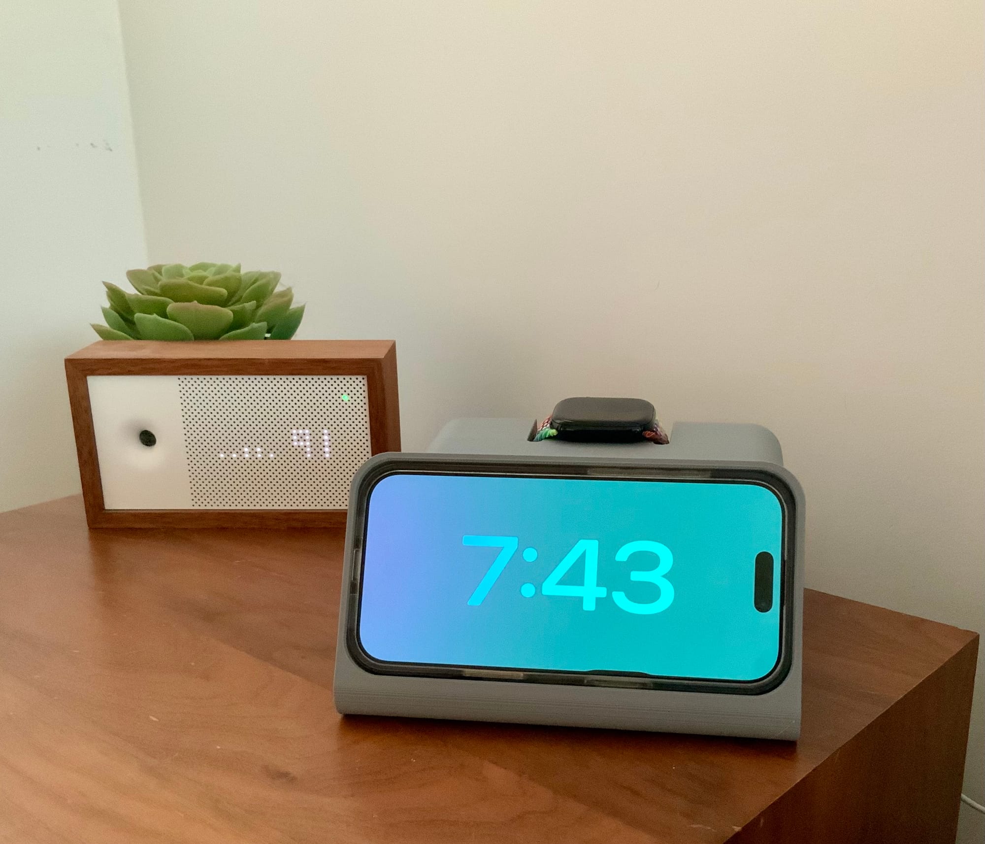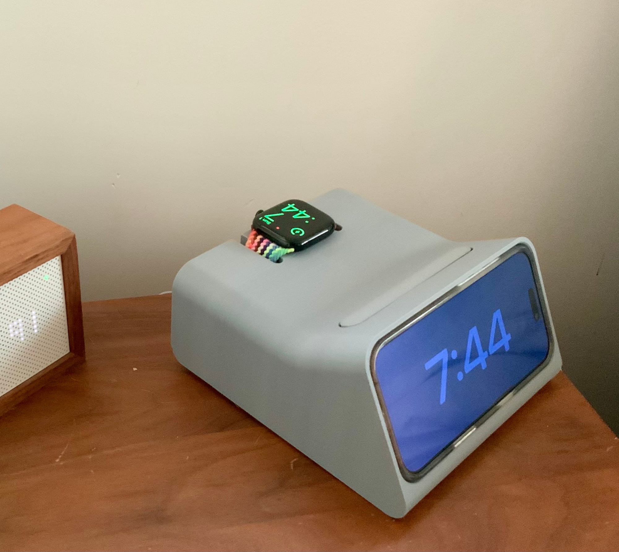 This morning, I grabbed it off the printer in the garage, slid the pushbutton/bar piece into it, and fed my cables for a MagSafe charger and watch charger through it. The charging pucks popped in tightly with a satisfying click. I tossed my phone and watch into it and took these photos from my bedside stand with my iPad.