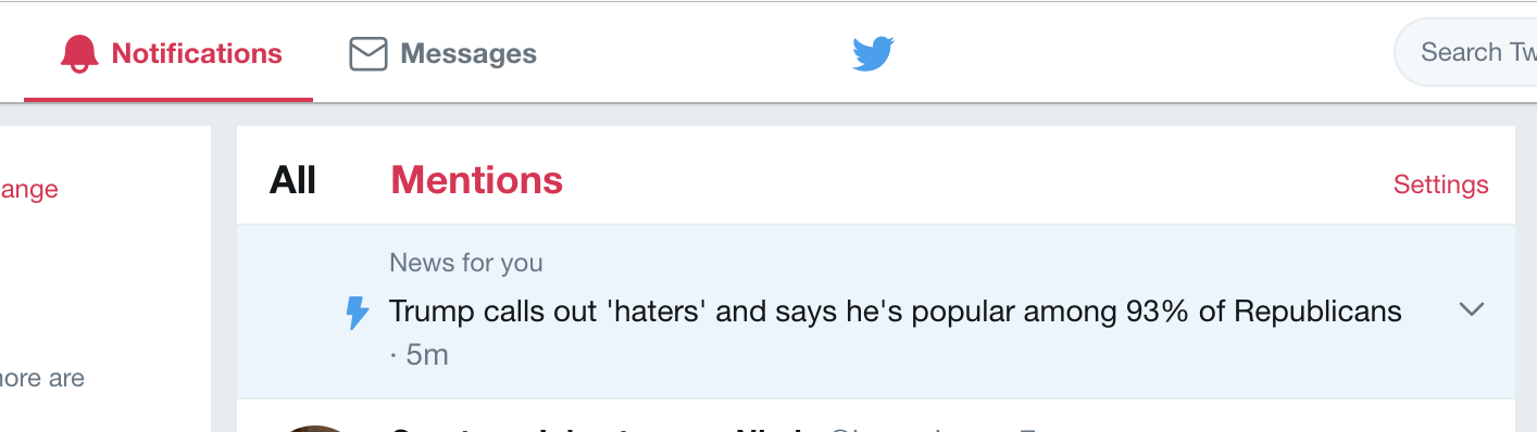 The first is inserting recent trending news into my list of notifications. For 12 years, my notifications tab has been filled with nothing but a feed of interactions on my tweets. It's been 100% personal and customized to just me for all that time. A couple months ago, they started adding in news alerts. At first, they weren't bad, it was a lot of CNN breaking news level things like "A major congressional hearing is now streaming" and it was kinda useful, but after a couple weeks it quickly devolved into "Trump did something" with a much lower bar. I've only recently unblocked Trump (tired of seeing friends RT his ugly messages into my timeline) and I have zero interest in hearing about the garbage things he says each day. If I wanted to know, I'd follow him. I'm sure there are great engagement numbers for these messages, but it's low information, high outrage fodder to me.