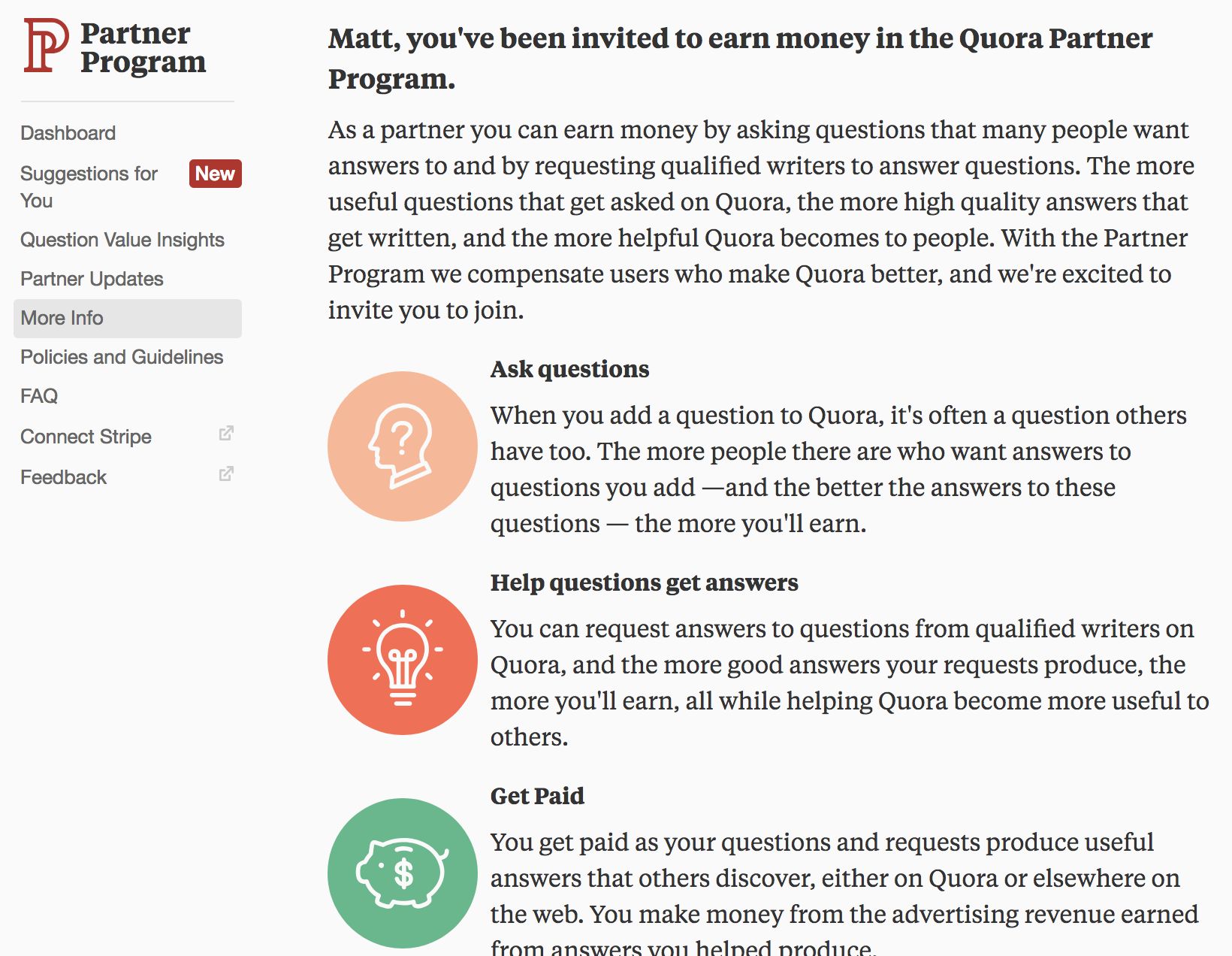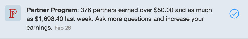 Finally, Quora recently started pitching me on their revenue program. In order to grow their service, they're now paying people based on questions and answers, and they give me a weekly notification and board of their top earners.