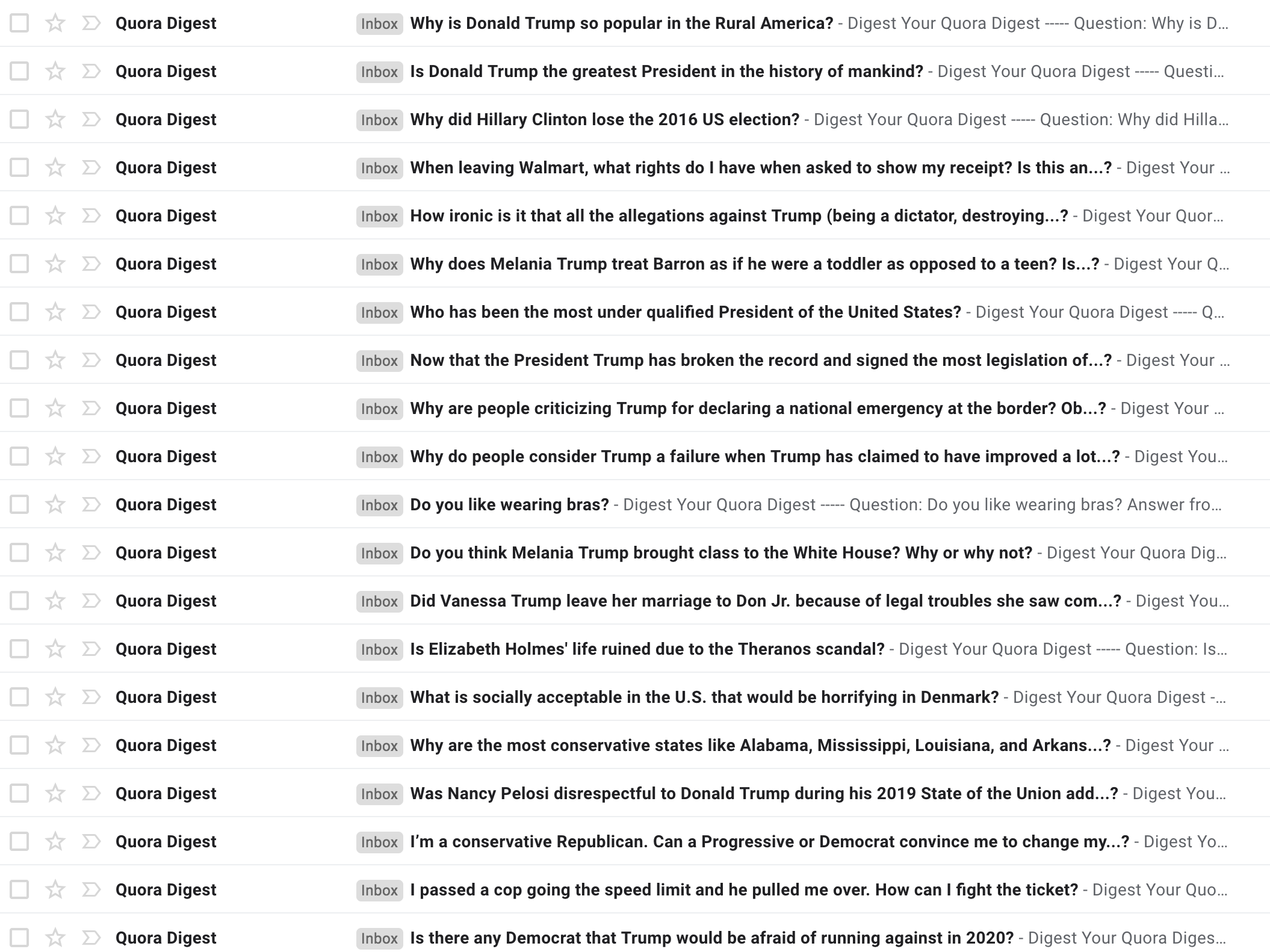 Is it because I click on questions that sound bananas according to Quora's algorithms so they show me more outrageous things each week? Or is it because people are getting paid to make highly engaging questions that set people off? I can't tell, but it feels like the service is measurably worse, since all Quora wants to show me are clueless questions from Trump supporters. If you look at the subjects above, it's almost a form of sealioning as people are "just asking questions" but my weekly digest email feels more like a pit of vipers than ten interesting questions I used to like reading.