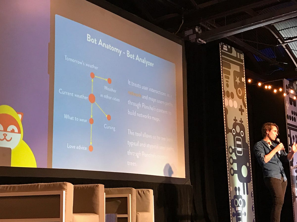 There are nearly a billion users (each) on three major chat app systems, which they see as their potential market. They’re trying to make weather fun, so they hired comedy writers to help write updates. Eventually it may talk about traffic and public transit outages for you in the morning before work. Poncho’s iOS app is an alarm clock based on current weather. Poncho will send a message on fb Messenger when it’s about to rain where you are. They wanted to review their bot, so they built a live real-time feed that lets them watch how users interact with the service, so they could make it smarter. They built a large CMS controlling triggers and messages so writers can easily write new posts. They also built their own bot analytics. Did tons of analytics works to refine the app and maintain retention.