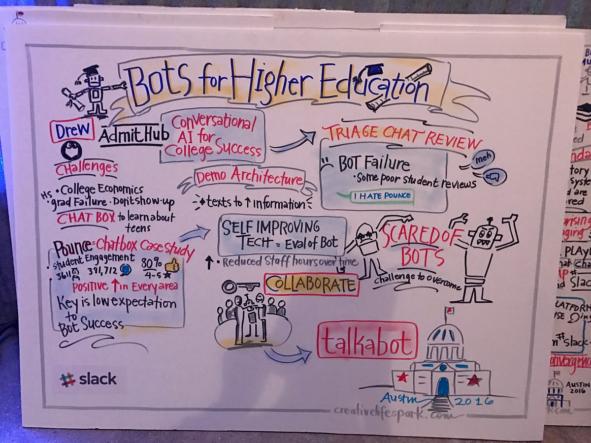 At Georgia State, 22% weren’t showing up the first day of class. After their bot was deployed it had a 64% high engagement, with 88% responding to it at least once. When students asked hard questions, they’d forward them to university staff to answer, but Drew had to build an email-as-interface for university staff, who didn’t want to use native chat clients. He ended up building an entire triage CMS (that looks like Slack) to handle questions from students and escalate them to the proper person to answer, etc.