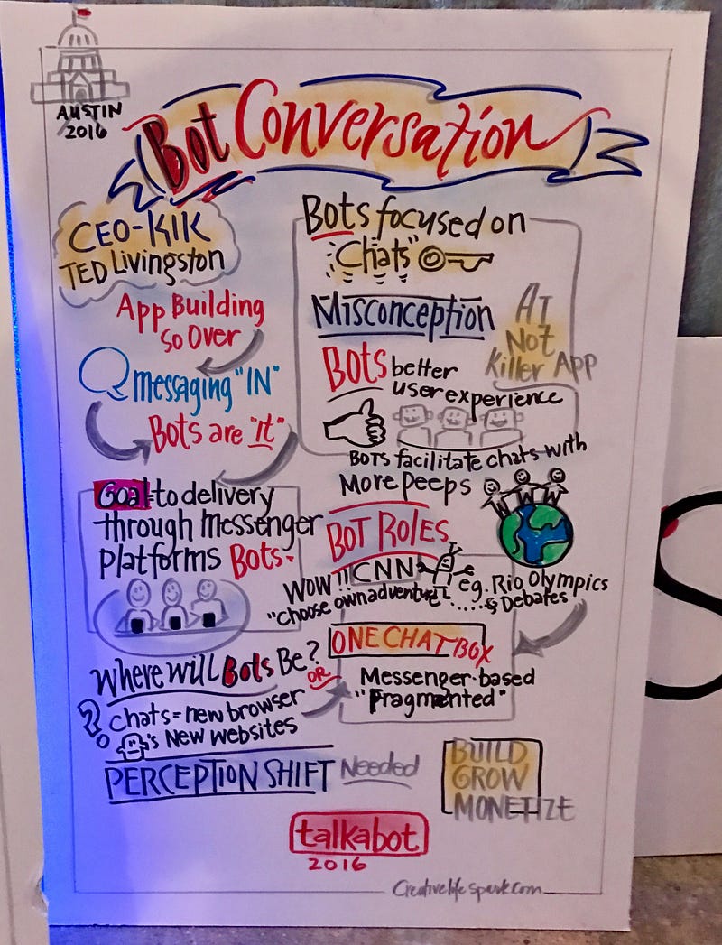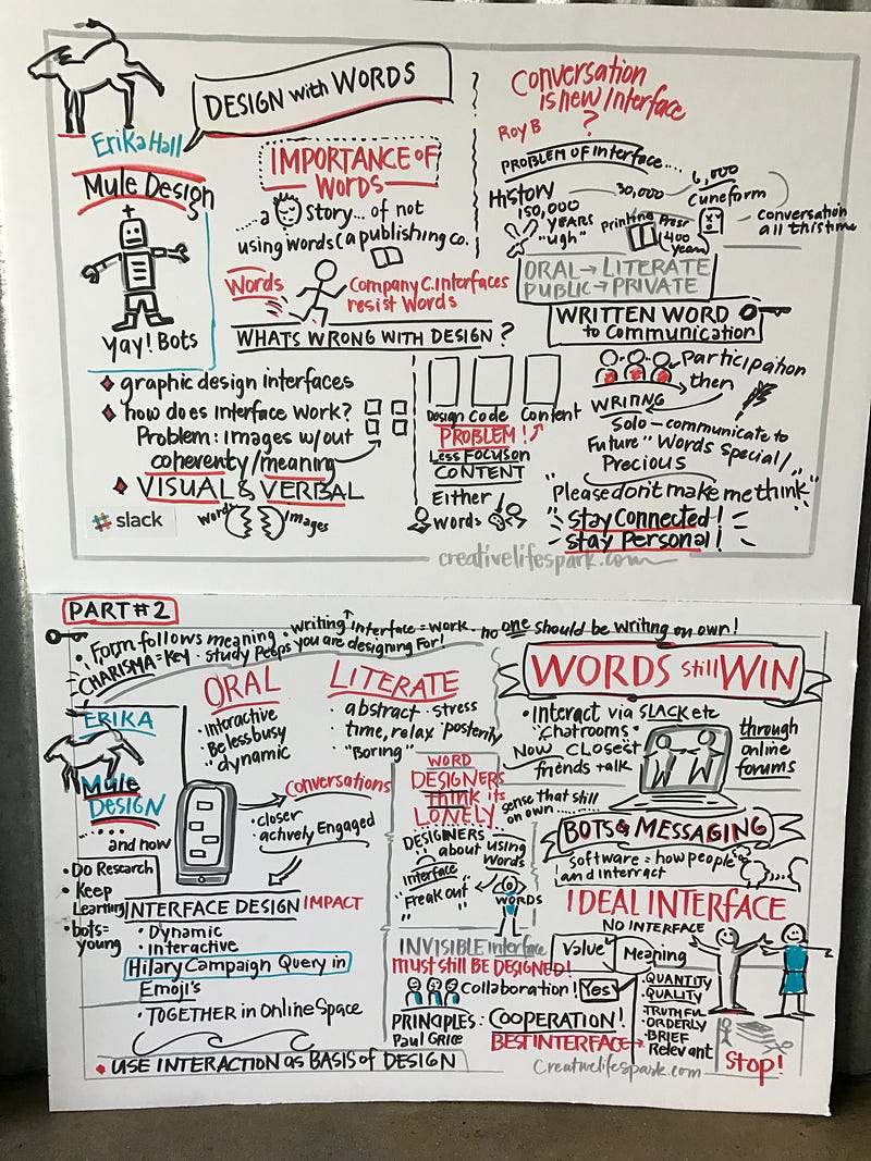 “Bots are words as design, words as apps, and we’re used to talking to one another so we should be flocking to these possibilities. Yet, the walls between coding, design, and content in most companies end up making apps worse, since content is often brought in late in the process, and they don’t get to monitor usage to improve after launch. Conversation is the new interface. Over 150,000 years we moved from an oral culture to a literary culture. Things that were public became private. Immediacy and context are terrific, being in the here and now. Words first! The ideal interface is no interface.”