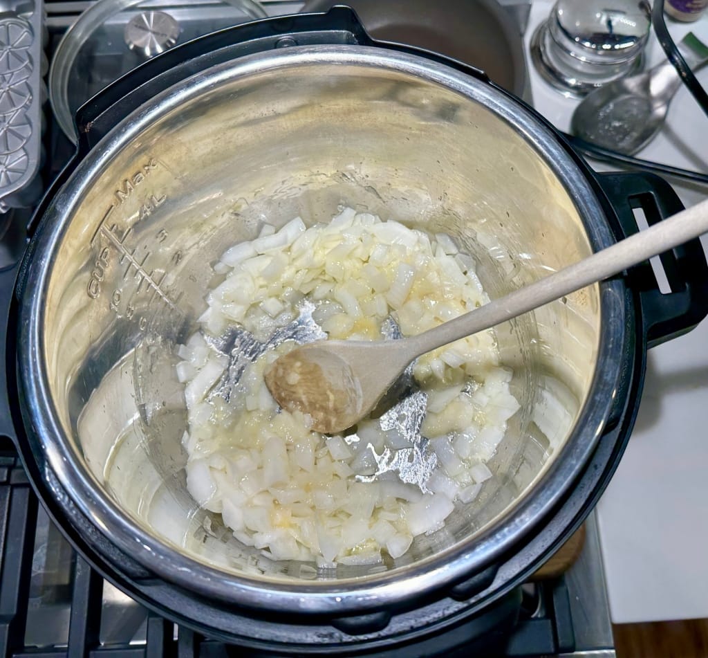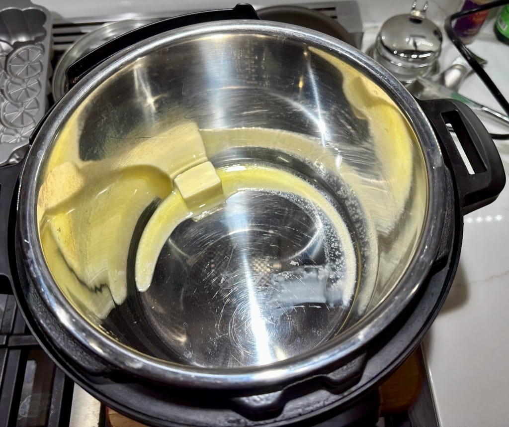 Put your instant pot on saute, and wait until it gets to full temp (the display says HOT), then toss in two tablespoons (quarter stick) of unsalted butter and let it go until it's all melted.