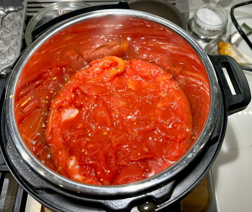 Add a 28oz can of peeled tomatoes, and crush up the tomatoes with your hands as you toss them into the pot to help liquify them. Throw in 1.5 to 2 pounds of boneless chicken thighs. Mix everything together, then make sure the tomato paste/liquids cover all the chicken before securing the lid.