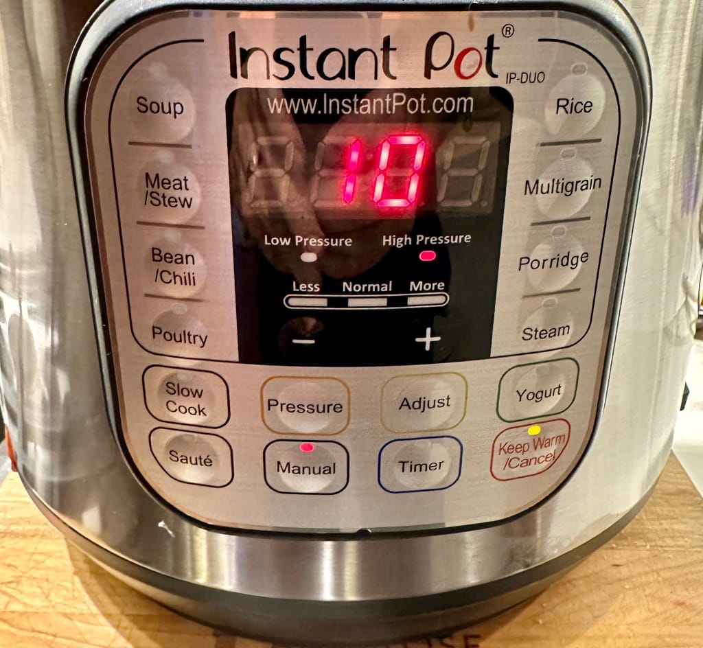 Set your InstantPot to a manual high pressure cook for 10min. It will likely take 10-15min to get up to pressure/temp before the 10min of cook time begins
