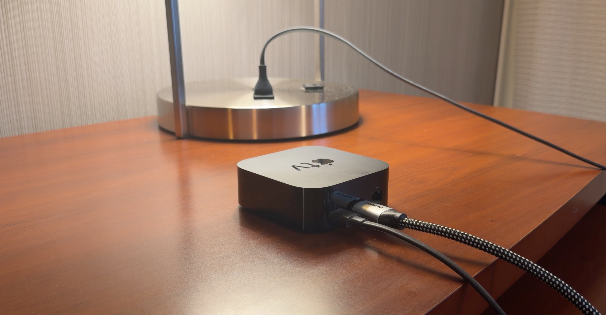 The AppleTV is my absolute favorite set-top box and I have two of them at home. I tend to upgrade them whenever a new version comes out, so I have a few older AppleTVs laying around and I recently started bringing one with a power cord and a short HDMI cable with me on trips.