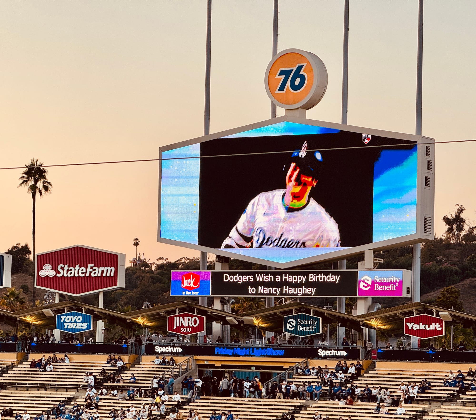 A couple years ago, I started watching Dodgers games more closely and following the team after a lifetime of my parents hating them because they were a rival of their beloved Angels. Near the end of the summer, I took a bunch of family and friends from LA out to one of the last games of the season, and it happened to be on the same day as my mom's birthday. Our group buy gave us the chance to put up a message during the pre-game, so we submitted a quick happy birthday message.