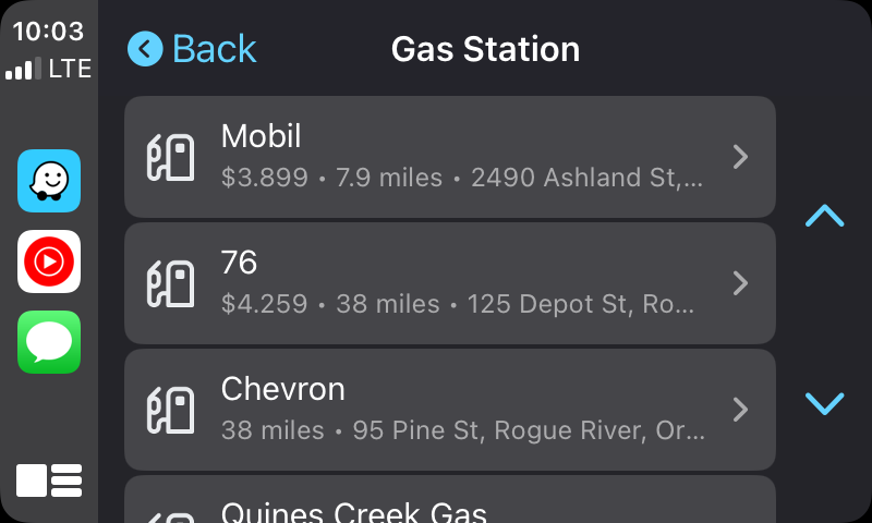 - If you say you want the nearest gas station, Waze shows you a list of addresses of gas stations. That's close to useless (especially in unfamiliar places) since some may be miles behind you already.