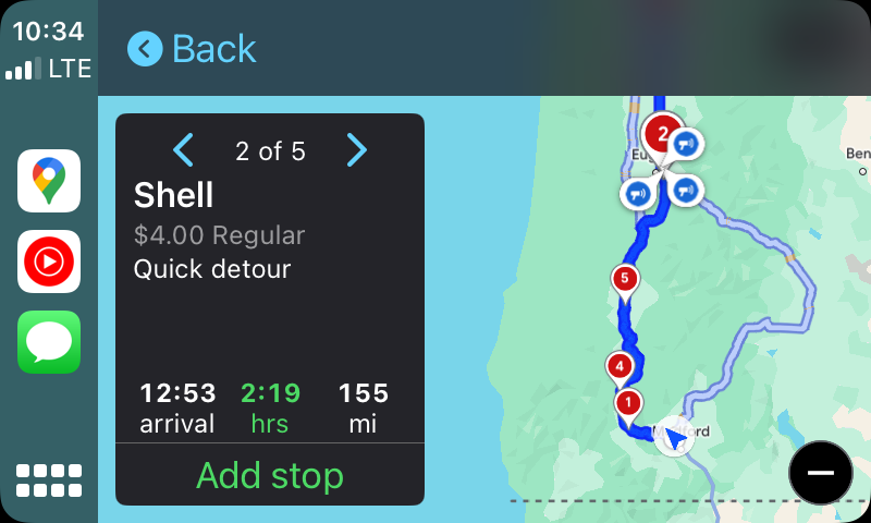 - When you tap on Gas stations, you get a map showing your current path and where each is located along the way, which is a super helpful way to find one!