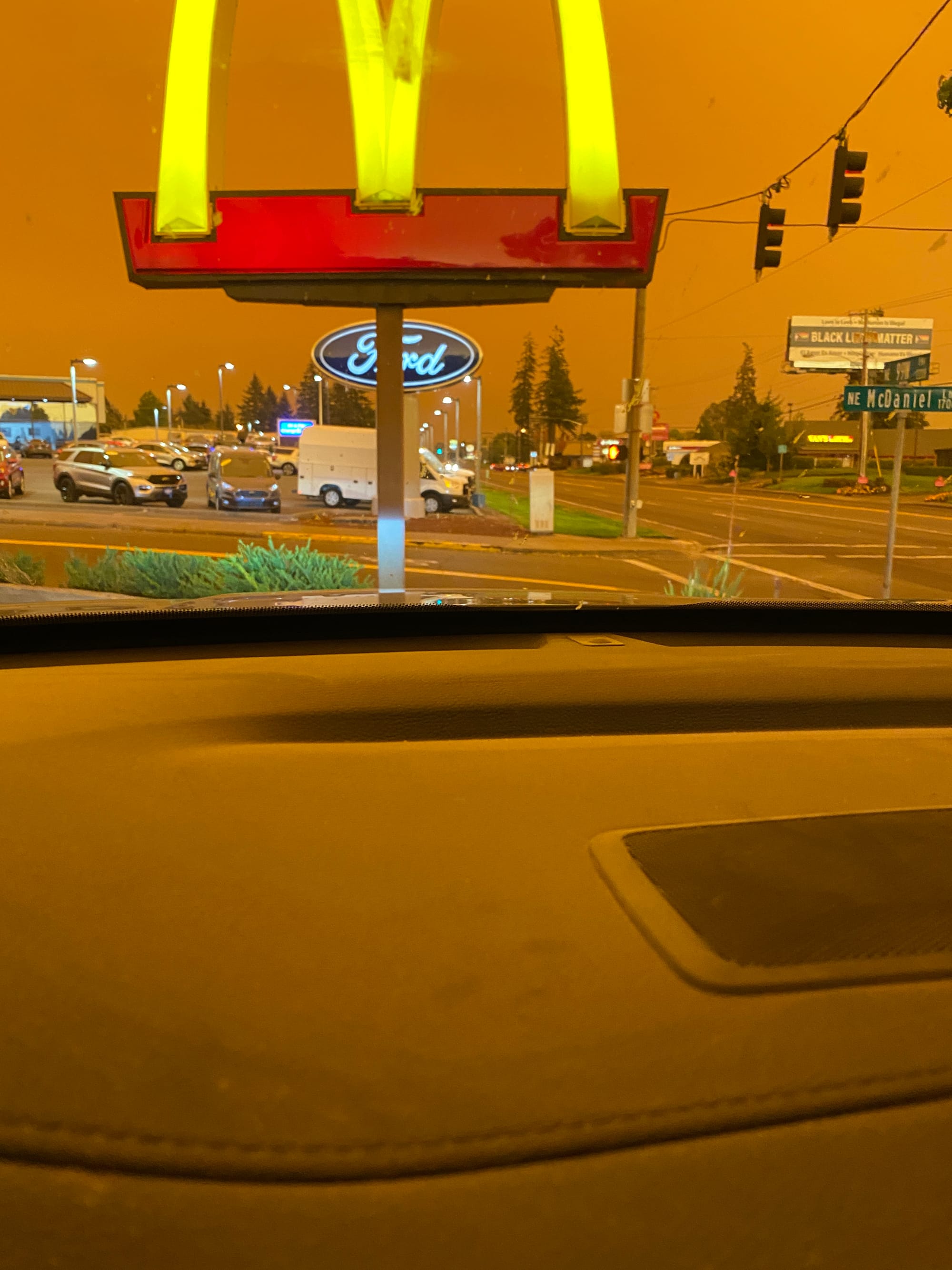 Here are my photos of the worst of it, from 9:55AM on the 9th, when I stopped at a McDonald's drive through to grab a McMuffin. This was the morning sky, and it helps to have some familiar signage to compare against.